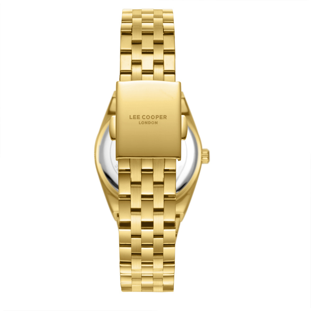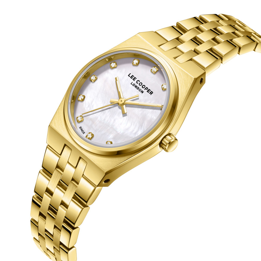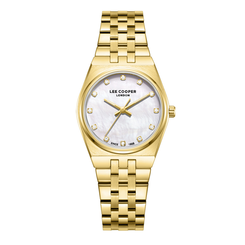 Красив дамски часовник Lee Cooper от колекцията Elegance. Моделът е с корпус от супер метал и верижка от неръждаема стомана. Диаметър на корпуса 30 мм. Аналогов дисплей в нежен седефен цвят и декорация от кристали. Стъкло минерал-кристал. Задвижва се от кварцов механизъм. Водоустойчивост 3 ATM - допускат се леки пръски, не се препоръчва обилно мокрене.
