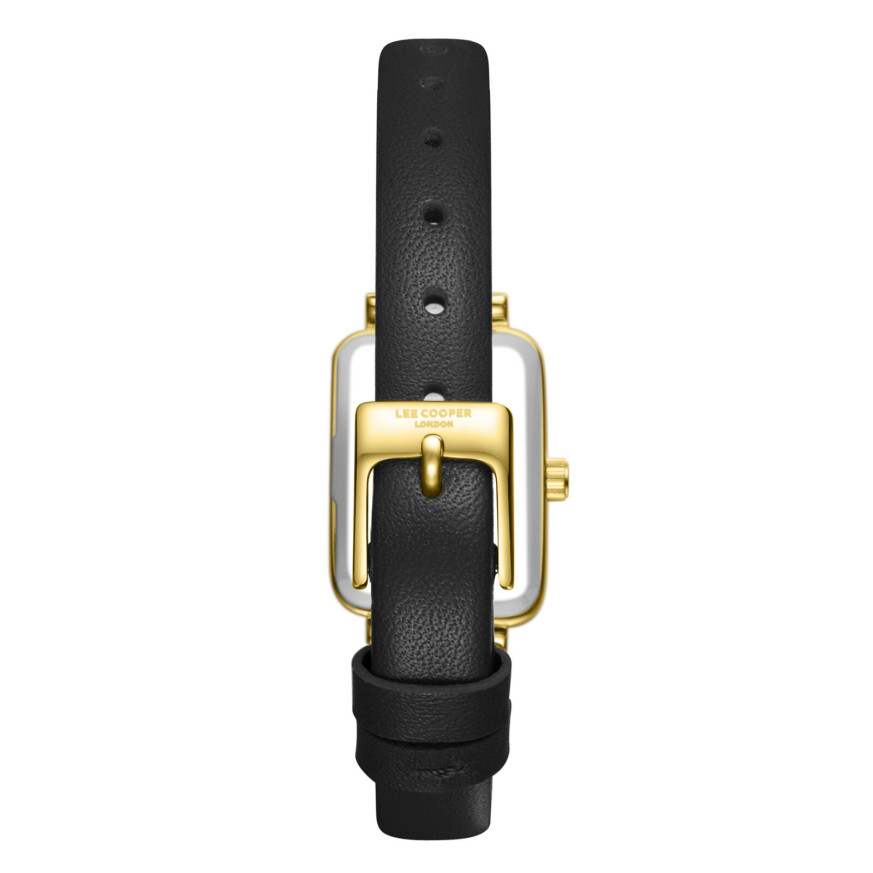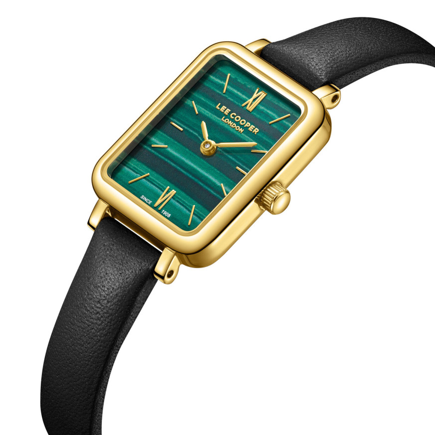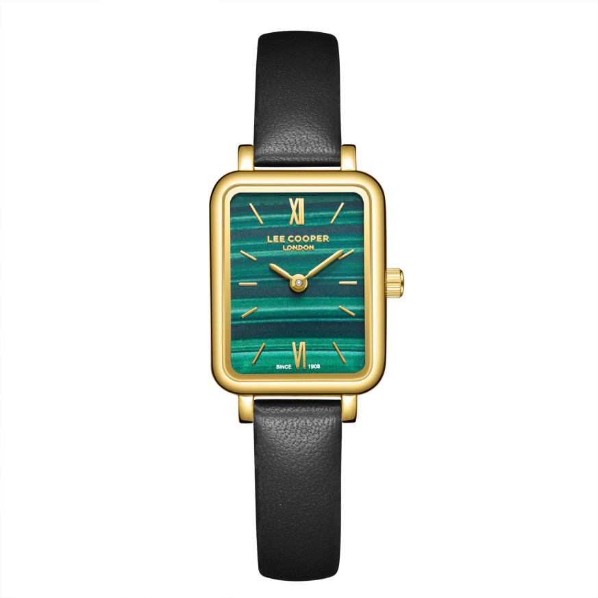 Класически модел часовник Lee Cooper със стилен дизайн. Корпус изработен от супер метал. Каишка от естествена кожа в черен цвят. Аналогов дисплей в преливащи зелени нюанси със златисти детайли. Стъкло минерал-кристал. Задвижва се от кварцов механизъм. Водоустойчивост 3 ATM - допускат се леки пръски, не се препоръчва обилно мокрене.