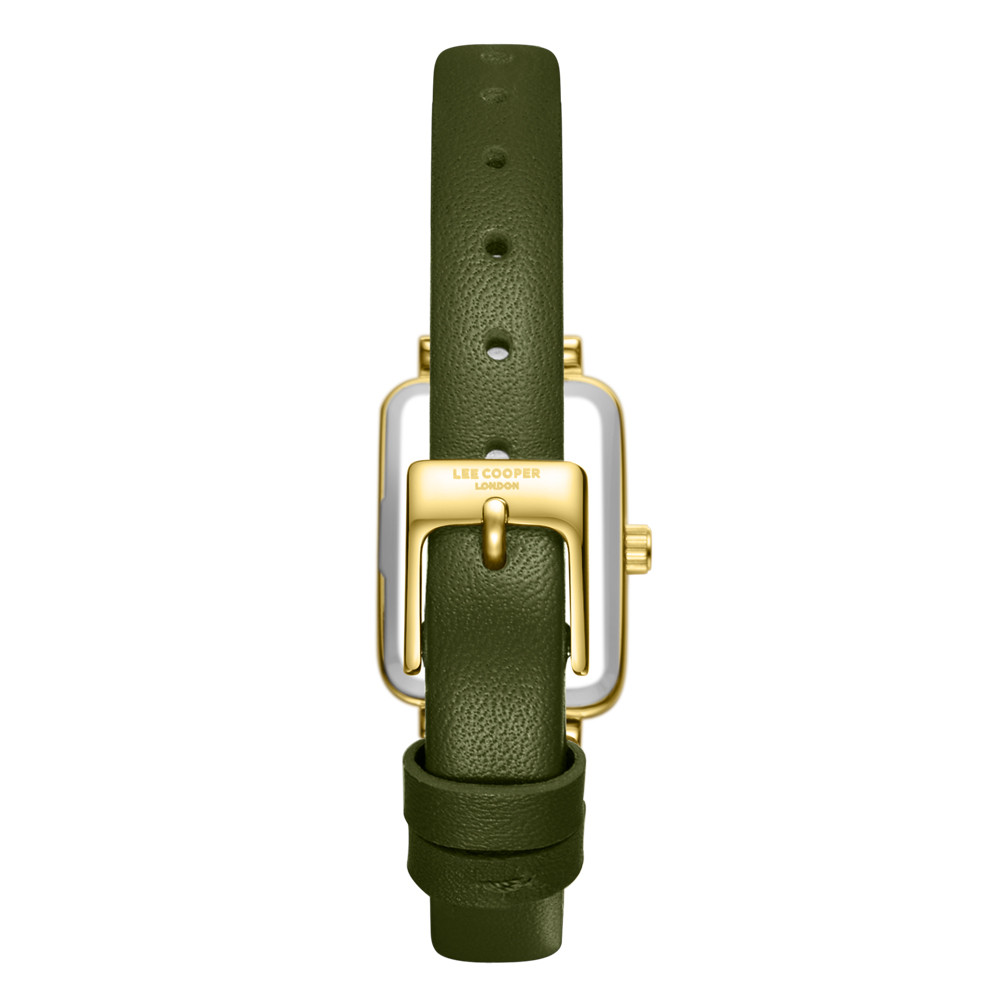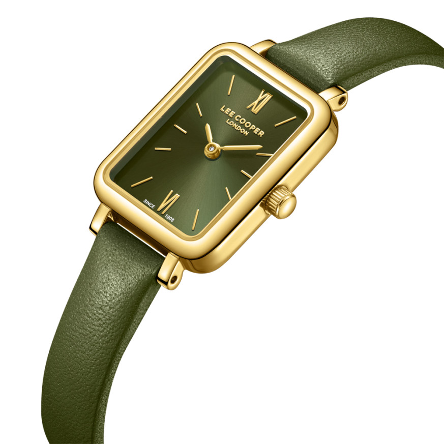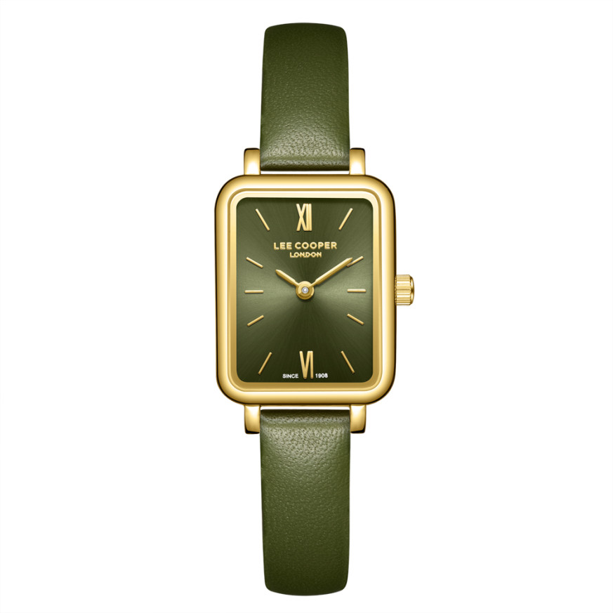 Класически модел часовник Lee Cooper със стилен дизайн. Корпус изработен от супер метал. Каишка от естествена кожа. Аналогов дисплей в зелен цвят със златисти детайли. Стъкло минерал-кристал. Задвижва се от кварцов механизъм. Водоустойчивост 3 ATM - допускат се леки пръски, не се препоръчва обилно мокрене.