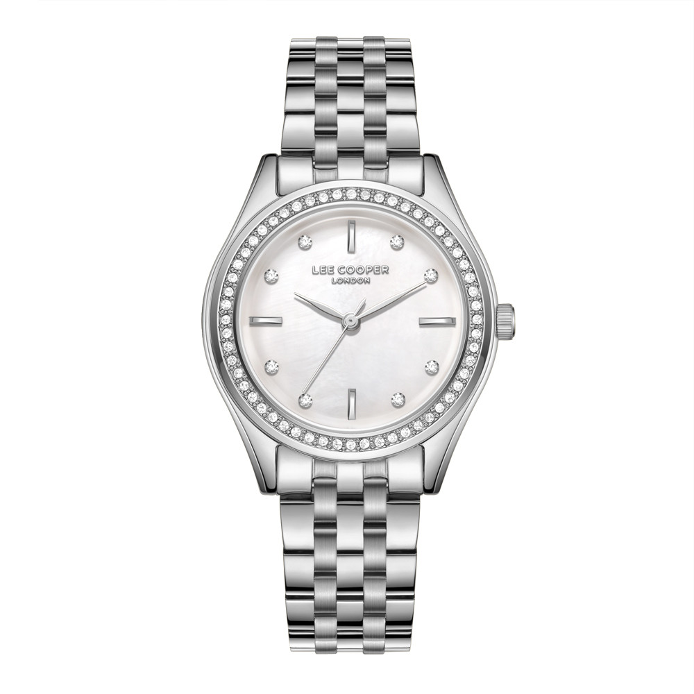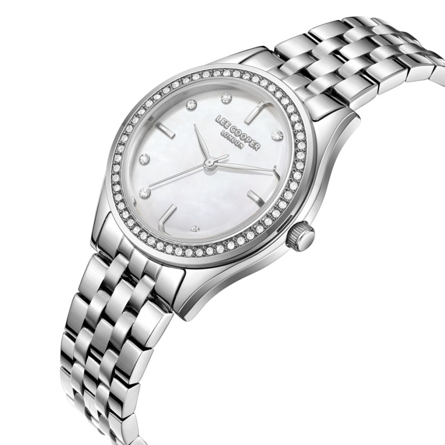 Стилен дамски часовник Lee Cooper от колекцията Elegance. Моделът е с декорация от нежни кристали по безела и дисплея. Корпус изработен от супер метал. Верижка от неръждаема стомана. Диаметър на корпуса 33 мм. Аналогов дисплей в седефен цвят. Стъкло минерал-кристал. Задвижва се от кварцов механизъм. Водоустойчивост 3 ATM - допускат се леки пръски, не се препоръчва обилно мокрене.