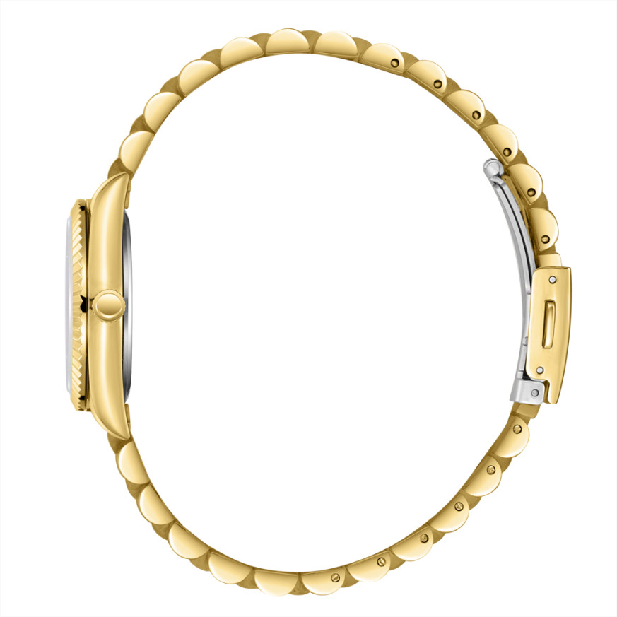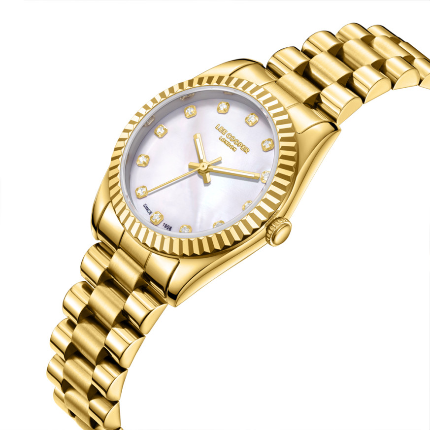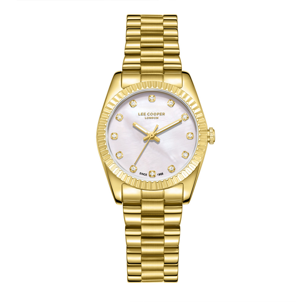 Елегантен дамски часовник Lee Cooper от колекцията Elegance. Корпус изработен от супер метал, съчетан с верижка от неръждаема стомана. Диаметър на корпуса 30 мм. Аналогов дисплей в красив седефен цвят със златисти стрелки и нежни кристали по индексите. Стъкло минерал-кристал. Задвижва се от кварцов механизъм. Водоустойчивост 3 ATM - допускат се леки пръски, не се препоръчва обилно мокрене.