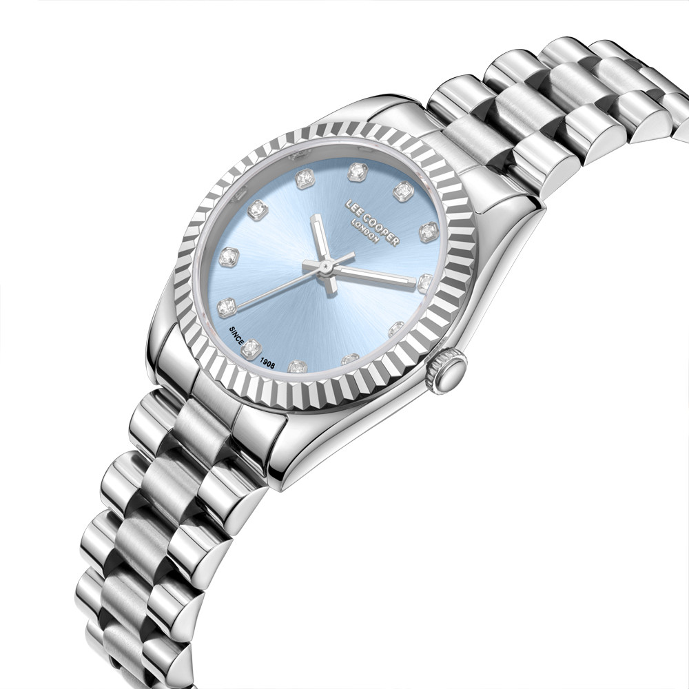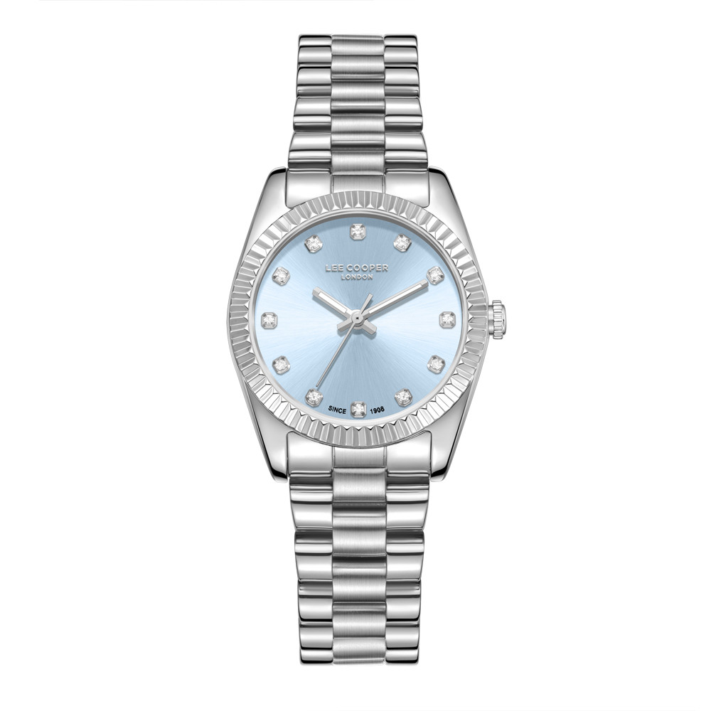 Дамски часовник Lee Cooper с метален корпус. Верижка от неръждаема стомана. Диаметър на корпуса 30 мм. Аналогов дисплей в син цвят със сребристи стрелки и нежни кристали по индексите. Стъкло минерал-кристал. Задвижва се от кварцов механизъм. Водоустойчивост 3 ATM - допускат се леки пръски, не се препоръчва обилно мокрене.