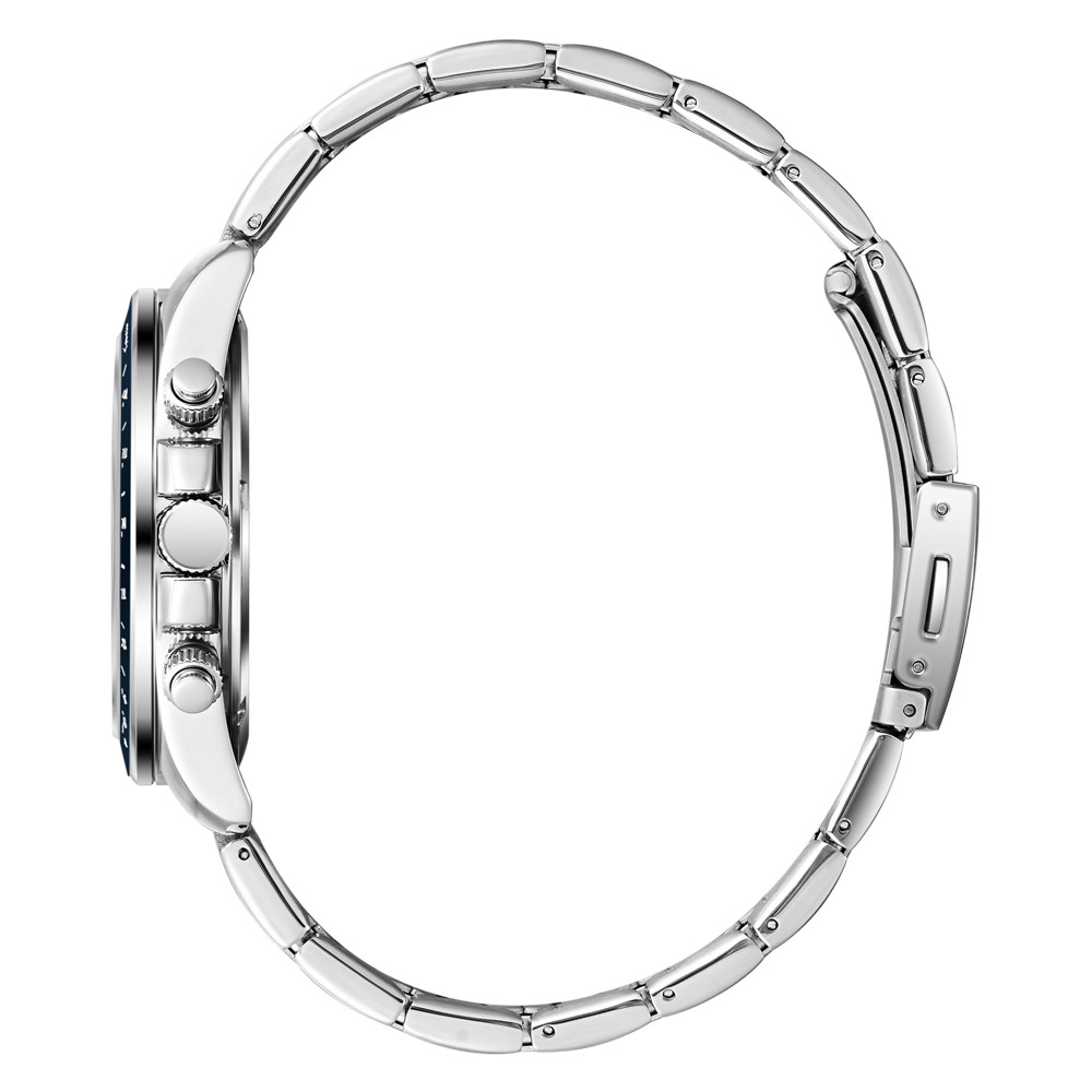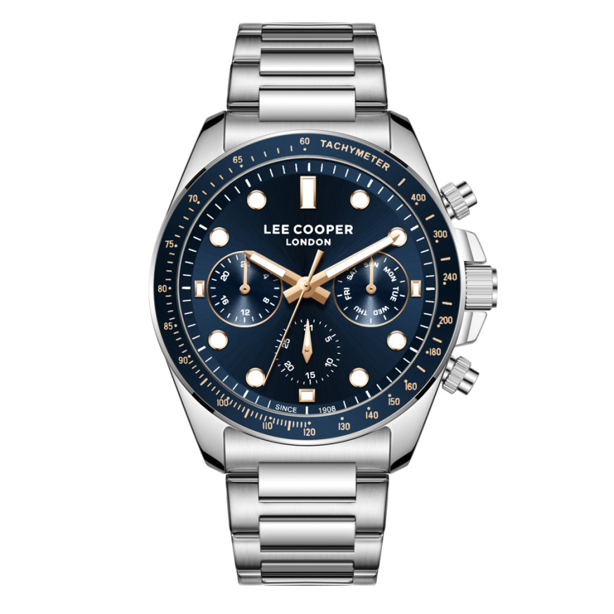 Спортно-елегантен мъжки часовник Lee Cooper с модерна визия. Моделът е с корпус от супер метал и верижка от неръждаема стомана. Диаметър на корпуса 42 мм. Стъкло минерал-кристал. Мултифункционален дисплей с показатели за дата, ден от седмицата и 24 часов формат. Луминесцентно покритие върху стрелките и индексите. Задвижва се от кварцов механизъм. Водоустойчивост 5 ATM - допускат се леки пръски и взимане на душ, не се препоръчва обилно мокрене.