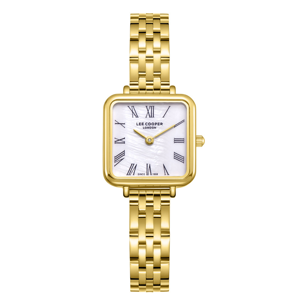 Класически модел дамски часовник Lee Cooper с изискана визия. Корпус изработен от супер метал. Верижка от неръждаема стомана. Аналогов дисплей в красив седефен цвят със златисти стрелки и черни римски цифри. Стъкло минерал-кристал. Задвижва се от кварцов механизъм. Водоустойчивост 3 ATM - допускат се леки пръски, не се препоръчва обилно мокрене.