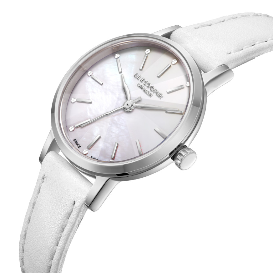 Стилен дамски часовник Lee Cooper от колекцията Elegance. Моделът е с корпус от супер метал и кожена каишка. Дисплеят е аналогов в красив седефен цвят със сребристи детайли и нежни кристали. Диаметър на корпуса 28 мм. Стъклото е минерал-кристал. Часовникът се задвижва от кварцов механизъм. Водоустойчивост 3 ATM - допускат се леки пръски, не се препоръчва обилно мокрене.
