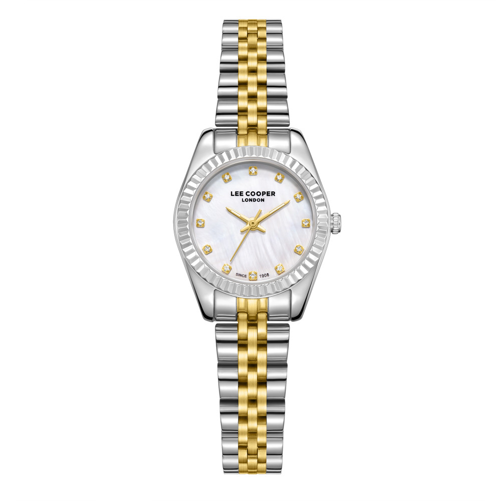 Елегантен дамски часовник Lee Cooper от колекцията Elegance. Моделът е с корпус от супер метал и верижка от неръждаема стомана. Дисплеят е аналогов в красив седефен цвят с дeкорация от нежни кристали. Диаметър на корпуса 25 мм. Стъклото е минерал-кристал. Часовникът се задвижва от кварцов механизъм. Водоустойчивост 3 ATM - допускат се леки пръски, не се препоръчва обилно мокрене.