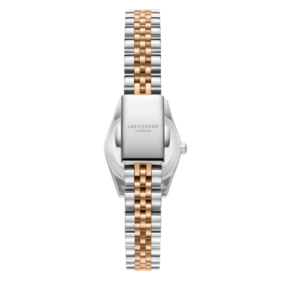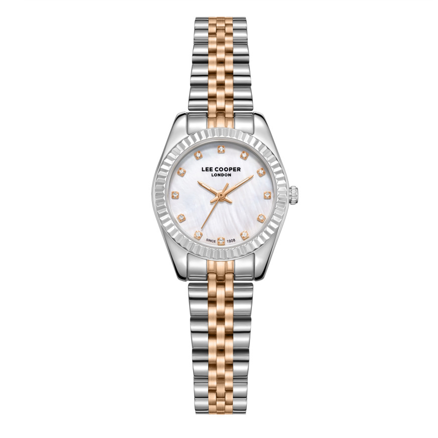 Елегантен дамски часовник Lee Cooper от колекцията Elegance. Моделът е с корпус от супер метал и верижка от неръждаема стомана. Дисплеят е аналогов в красив седефен цвят с дeкорация от нежни кристали. Диаметър на корпуса 25 мм. Стъклото е минерал-кристал. Часовникът се задвижва от кварцов механизъм. Водоустойчивост 3 ATM - допускат се леки пръски, не се препоръчва обилно мокрене.