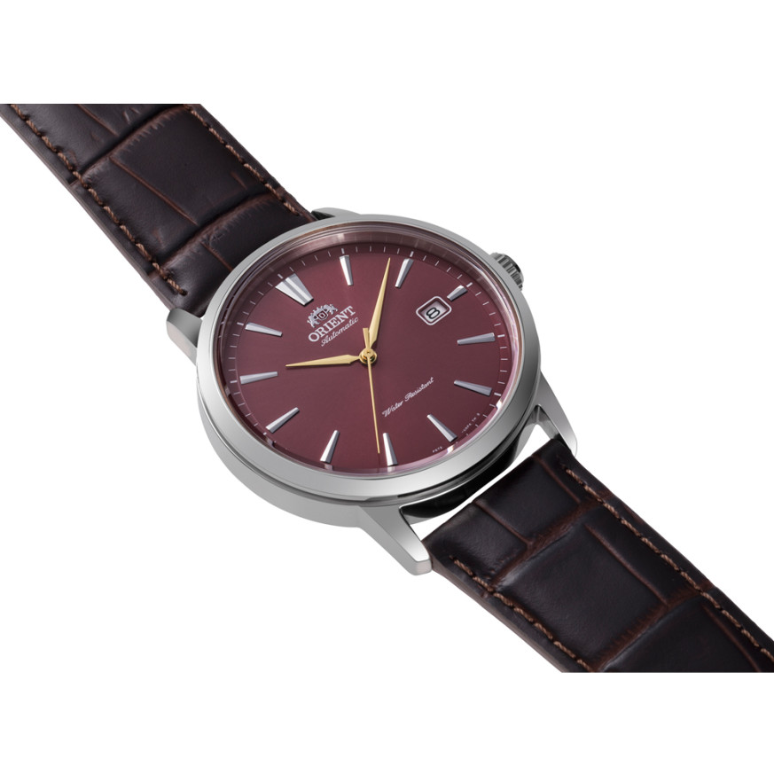 Часовник Orient RA-AC0F15R е стилен мъжки модел от колекцията Contemporary, отличаващ се с елегантен тъмночервен циферблат, златисти стрелки и сребристи индекси. Корпусът от благородна стомана и кафявата кожена каишка изграждат баланчен и изтънчен дизайн, подходящ за ежедневно носене и официални поводи. Автоматичният механизъм Cal. F6722 се вижда през прозрачния гръб и предлага надеждност и плавна работа. Минерал-кристалът предпазва от надраскване, а водоустойчивост 5 ATM осигурява удобство в ежедневието.