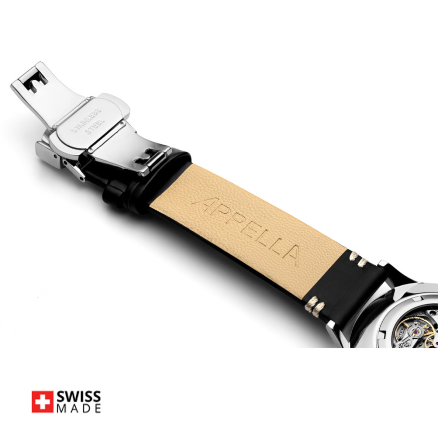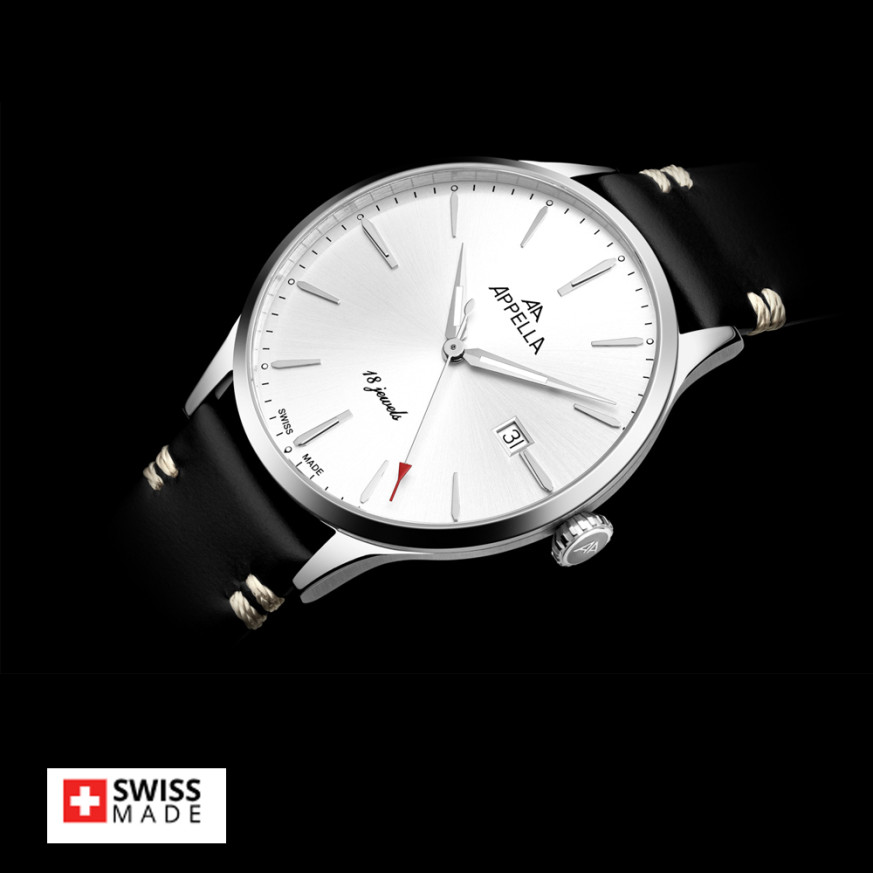 Елегантен мъжки часовник Appella L90.5213M. Корпусът е изработен от неръждаема стомана и е с диаметър 41 мм и дебелина 9 мм. Каишката е от естествена кожа. Аналогов дисплей в сребрист цвят с показател за дата. Стъклото е  сапфир-кристал. Моделът е с прозрачен заден капак, през който може да се наблюдава механизма. Часовникът се задвижва от механизъм Sellita SW 210 Swiss Made. Водоустойчивост 3 ATM - допускат се леки пръски, не се препоръчва обилно мокрене.