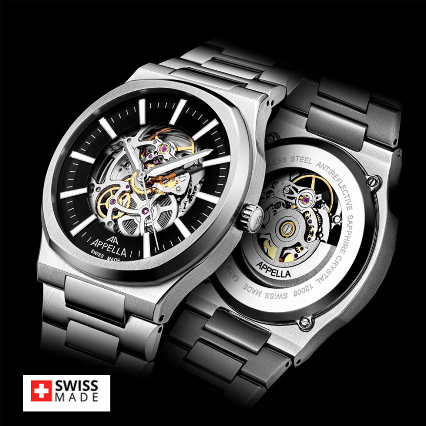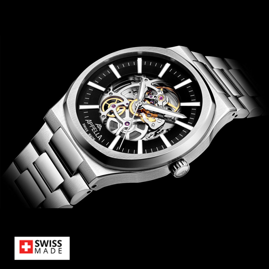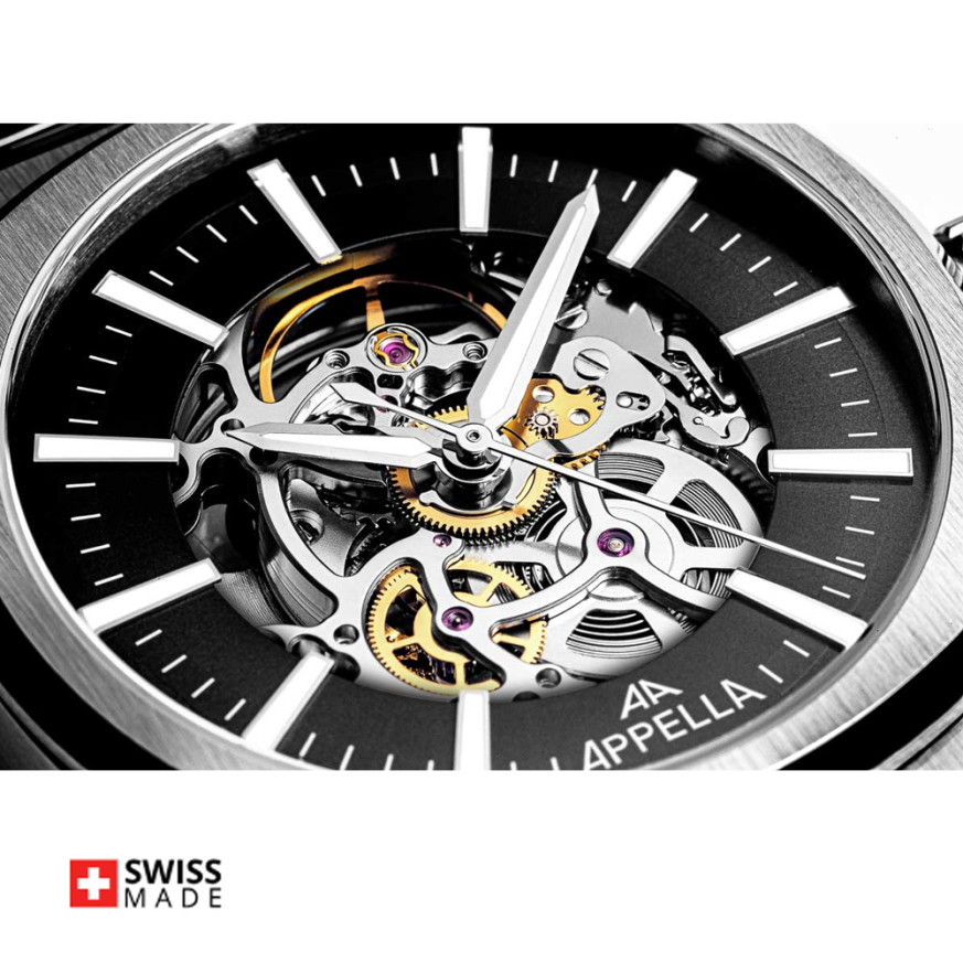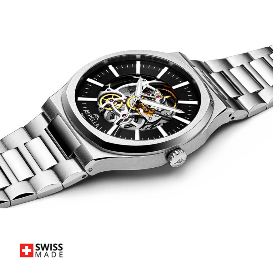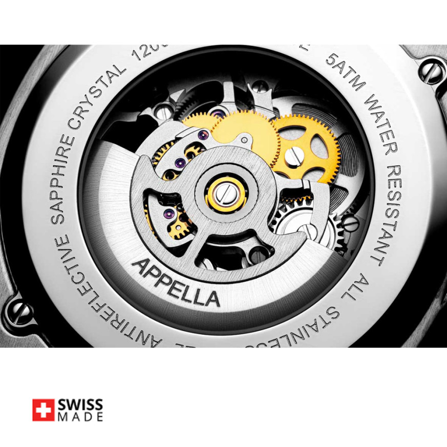 Мъжки часовник Appella L12006.5114ASQ впечатлява със своята уникална визия. Моделът е с корпус и верижка изработени от неръждаема стомана. Дисплеят е тип скелетон с модерен и стилен дизайн. Стрелките и индексите са с луминисцентно покритие. Стъклото е  сапфир-кристал с антирефлексно покритие. Часовникът се задвижва от кварцов механизъм SOPROD P024 Swiss Made. През прозрачния гръб на корпуса може да се наблюдава механизма на часовника.  Диаметър на корпуса 42.5 мм. Водоустойчивост 5 ATM - допускат се леки пръски и взимане на душ, не се препоръчва обилно мокрене.