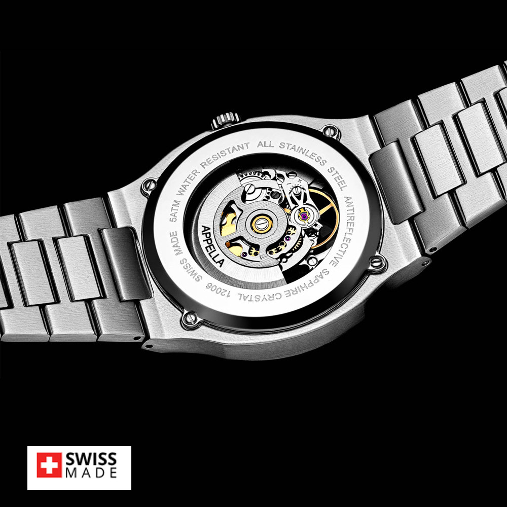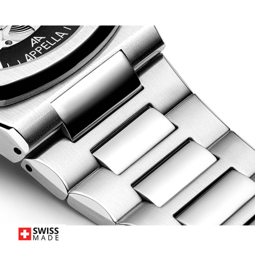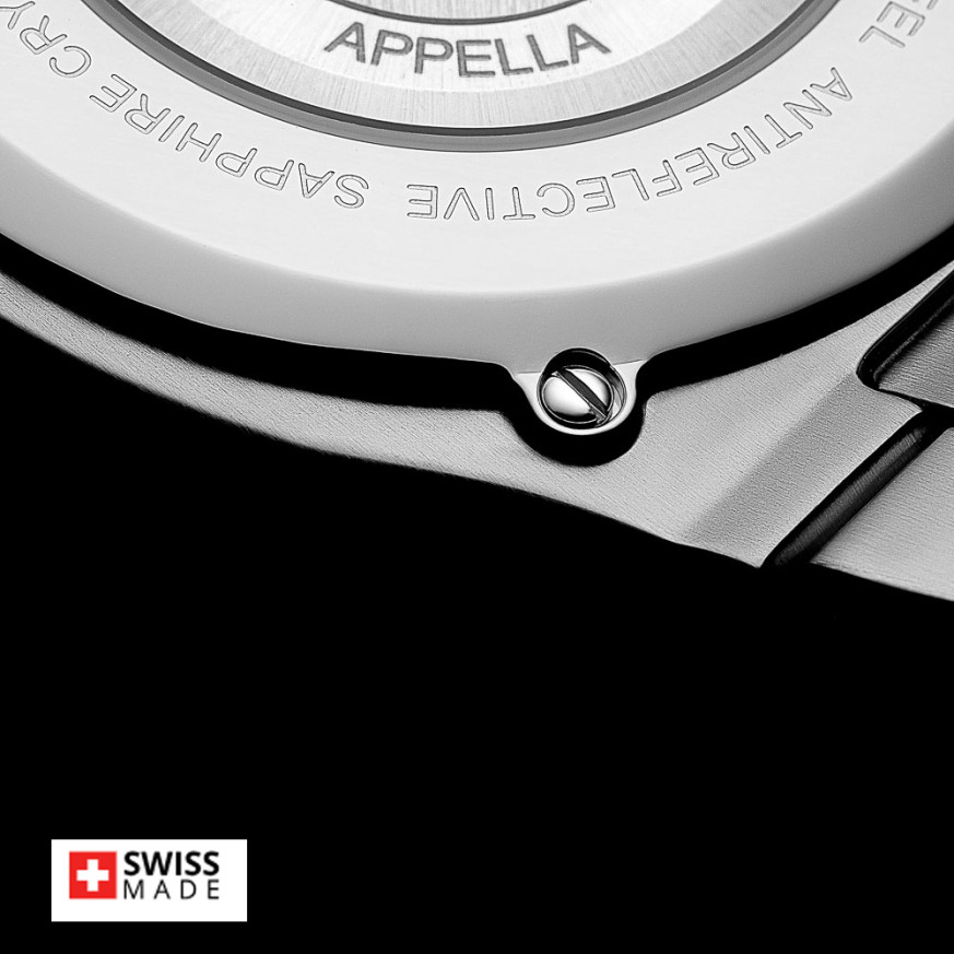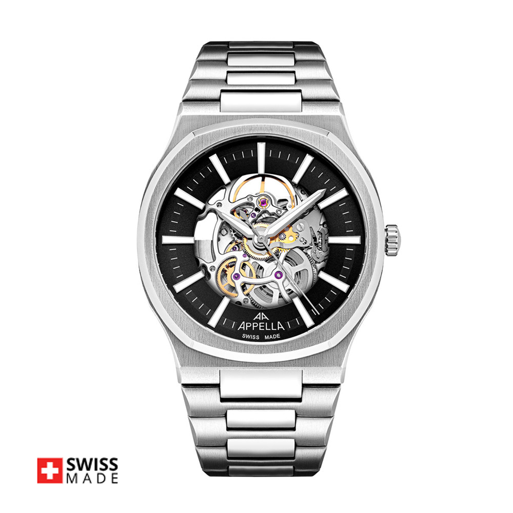 Мъжки часовник Appella L12006.5114ASQ впечатлява със своята уникална визия. Моделът е с корпус и верижка изработени от неръждаема стомана. Дисплеят е тип скелетон с модерен и стилен дизайн. Стрелките и индексите са с луминисцентно покритие. Стъклото е  сапфир-кристал с антирефлексно покритие. Часовникът се задвижва от кварцов механизъм SOPROD P024 Swiss Made. През прозрачния гръб на корпуса може да се наблюдава механизма на часовника.  Диаметър на корпуса 42.5 мм. Водоустойчивост 5 ATM - допускат се леки пръски и взимане на душ, не се препоръчва обилно мокрене.