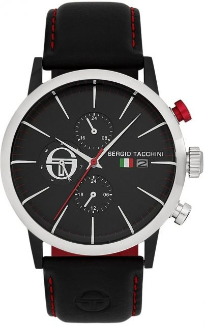 Спортно-елегантен мъжки часовник Sergio Tacchini с мултифункционален дисплей. Корпус от неръждаема стомана в комбинация с каишка от естествена кожа. Стъкло минерал-кристал. Прецизен кварцов механизъм JP15 CITIZEN MIYOTA произведен в Япония. Водоустойчивост 5 ATM - допускат се леки пръски и взимане на душ, не се препоръчва обилно мокрене.