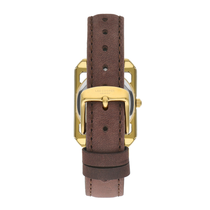 Дамски часовник Lee Cooper със спортно-елегантен дизайн. Моделът е с корпус от супер метал и кожена каишка. Аналогов дисплей в нежен седефен цвят със златисти детайли. Стъкло минерал-кристал. Задвижва се от кварцов механизъм. Водоустойчивост 3 ATM - допускат се леки пръски, не се препоръчва обилно мокрене.