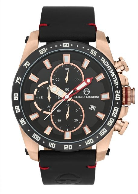 Мъжки часовник Sergio Tacchini  със спортно-елегантен дизайн от колекцията Archivio Chronograph. Моделът е с дисплей хронограф (точност 1/10 от секундата и максимално измервано време 60 минути). Фосфоресцентно покритие на стрелките и индексите. Минерално стъкло, устойчиво на надраскване. Корпус от неръждаема стомана, съчетан с каишка от естествена кожа. Прецизен кварцов механизъм VD57 SEIKO HATTORI произведен в Япония. Водоустойчивост 5 ATM - допускат се леки пръски и взимане на душ, не се препоръчва обилно мокрене.