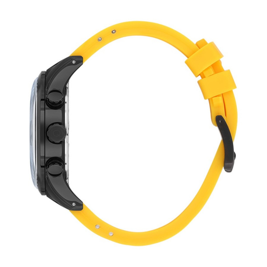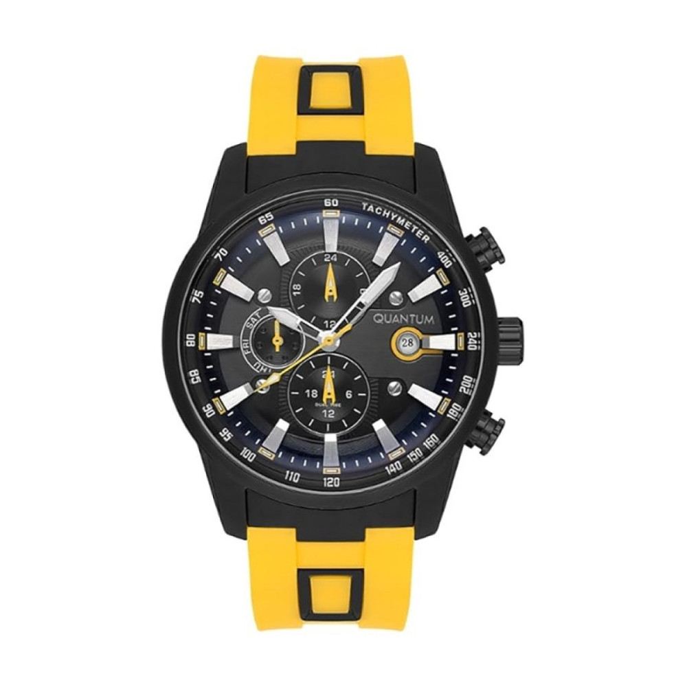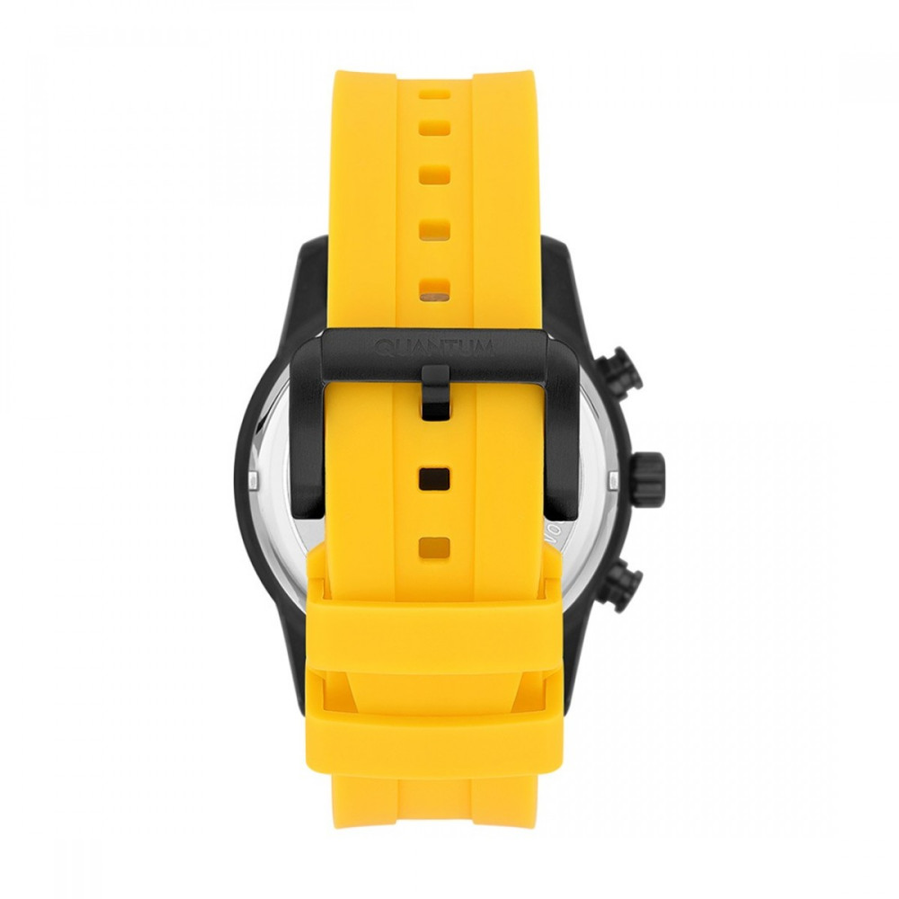 Мъжки часовник Quantum със спортен дизайн от колекцията Adrenaline. Черен мултифункционален дисплей с детайли в сребрист и жълт цвят. Луминесцентно покритие върху стрелките. Стъкло минерал-кристал. Корпус  изработен от неръждаема стомана. Жълта силиконова каишка с черни акценти. Диаметър на корпуса 47 мм. Задвижва се от кварцов механизъм. Водоустойчивост 10 ATM - позволява мокрене, къпане и плуване във водни басейни.