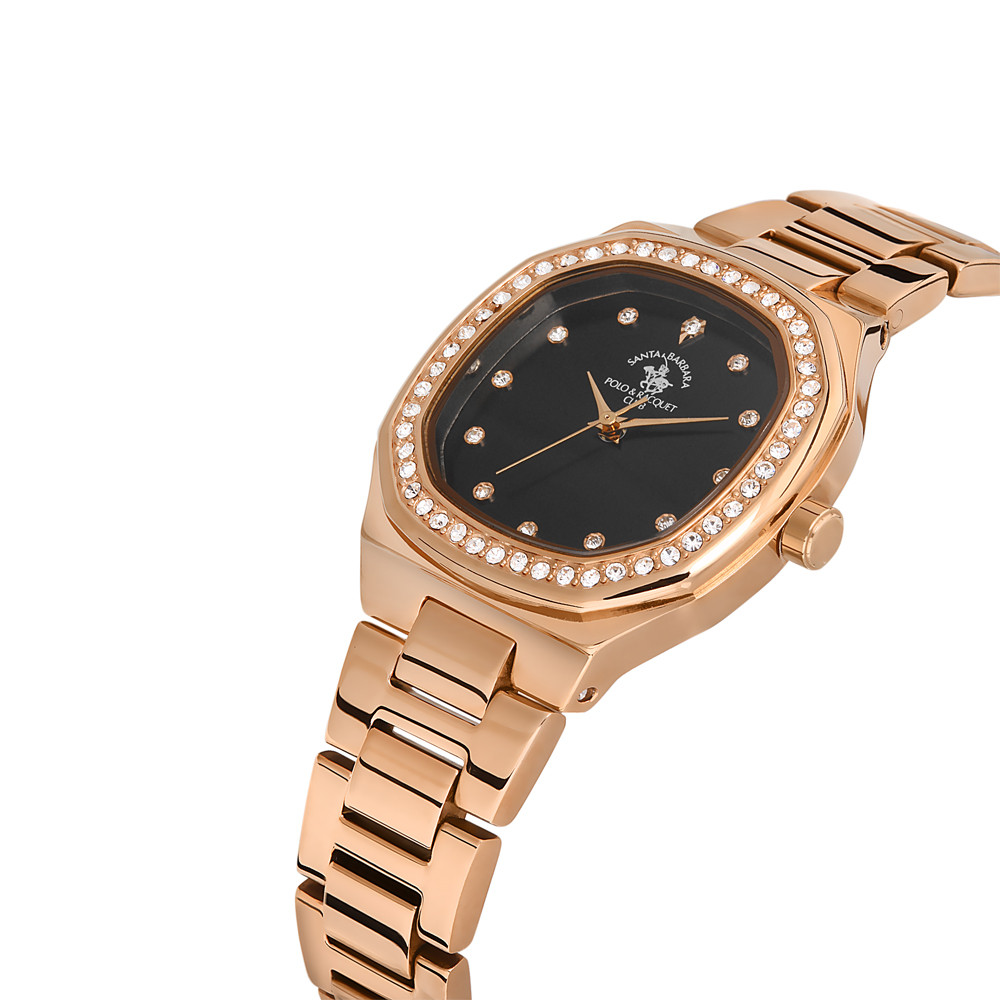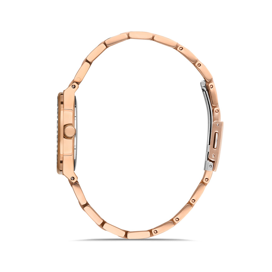 Елегантен дамски часовник от колекцията Unique. Декорация от нежни кристали по безела и циферблата. Моделът е с аналогов дисплей и минерално стъкло. Корпус и верижка изработени от неръждаема стомана. Задвижва се от кварцов механизъм. Водоустойчивост 5 ATM - допускат се леки пръски и взимане на душ, не се препоръчва обилно мокрене.