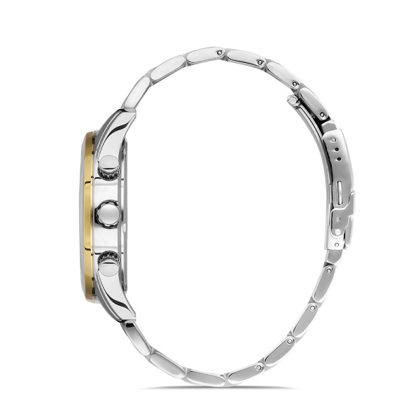 Мъжки часовник с модерен спортно-елегантен дизайн. Дисплей тип хронограф в черен цвят със златисти детайли. Луминисцентно покритие върху стрелките и индексите. Стъкло минерал-кристал. Корпус и верижка изработени от неръждаема стомана. Моделът се задвижва от кварцов механизъм. Водоустойчивост 5 ATM - допускат се леки пръски и взимане на душ, не се препоръчва обилно мокрене.