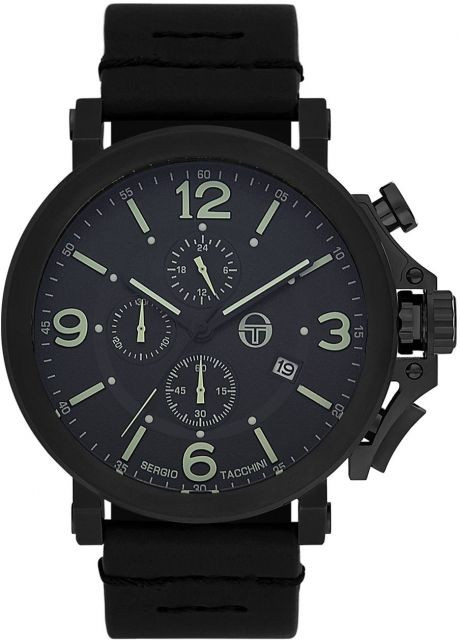 Мъжки часовник Sergio Tacchini  със спортно-елегантен дизайн от колекцията Heritech Chronograph. Дисплей хронограф с точност 1/60 от минутата и максимално измервано време 30 минути. Фосфоресциращи стрелки и индекси. Минерално стъкло, устойчиво на надраскване с антирефлексно покритие. Корпус от неръждаема стомана. Каишка от естествена кожа с декоративен шев. Прецизен кварцов механизъм JS15 CITIZEN MIYOTA произведен в Япония. Водоустойчивост 10 ATM - позволява мокрене, къпане и плуване във водни басейни.