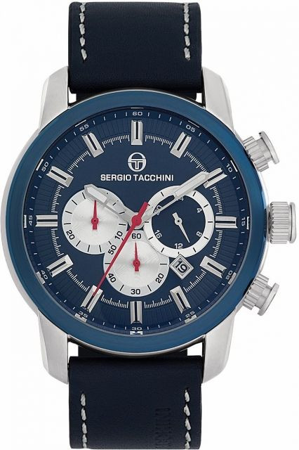 Спортно-елегантен мъжки часовник Sergio Tacchini от колекцията Archivio Chronograph. Моделът е с тъмносин дисплей хронограф с точност 1/60 от минутата и максимално измервано време 30 минути. Фосфоресциращи стрелки. Минерално стъкло, устойчиво на надраскване с антирефлексно покритие. Корпус от неръждаема стомана, съчетан с каишка от естествена кожа. Прецизен кварцов механизъм JS25 CITIZEN MIYOTA произведен в Япония. Водоустойчивост 10 ATM - позволява мокрене, къпане и плуване във водни басейни.