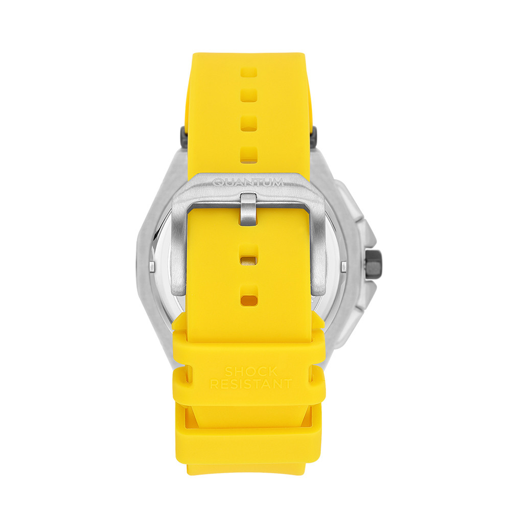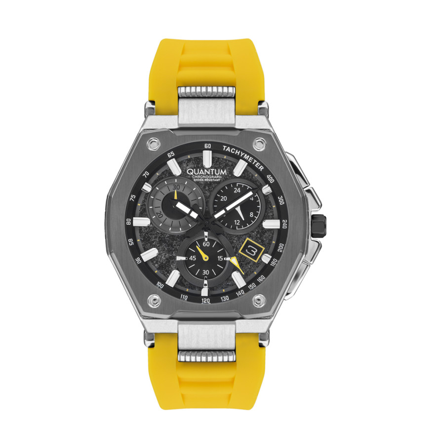 Страхотен модел мъжки часовник Quantum с дисплей хронограф. Стъкло минерал-кристал с антирефлексно покритие. Корпус от неръждаема стомана. Силиконова каишка в жълт цвят. Часовникът се задвижва от кварцов механизъм. Водоустойчивост 10 ATM - позволява мокрене, къпане и плуване във водни басейни.