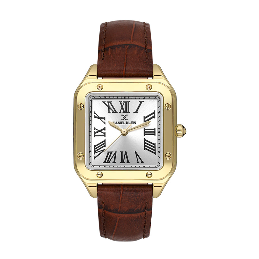 Дамски часовник Daniel Klein с метален корпус и каишка от естествена кожа. Моделът е с аналогов дисплей и стъкло минерал-кристал. Задвижва се от карцов механизъм. Водоустойчивост 3 ATM - допускат се леки пръски, не се препоръчва обилно мокрене.