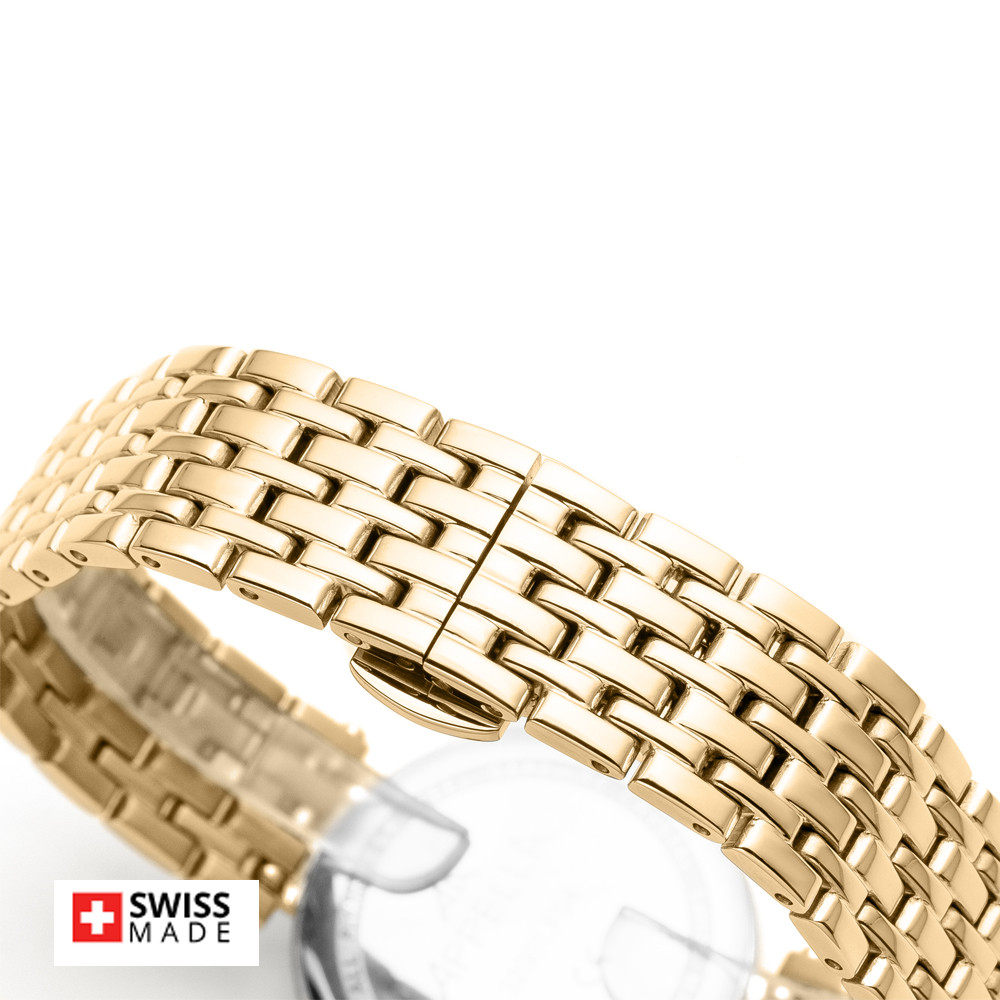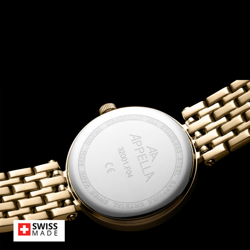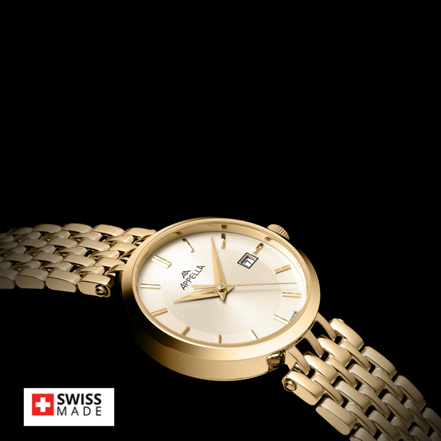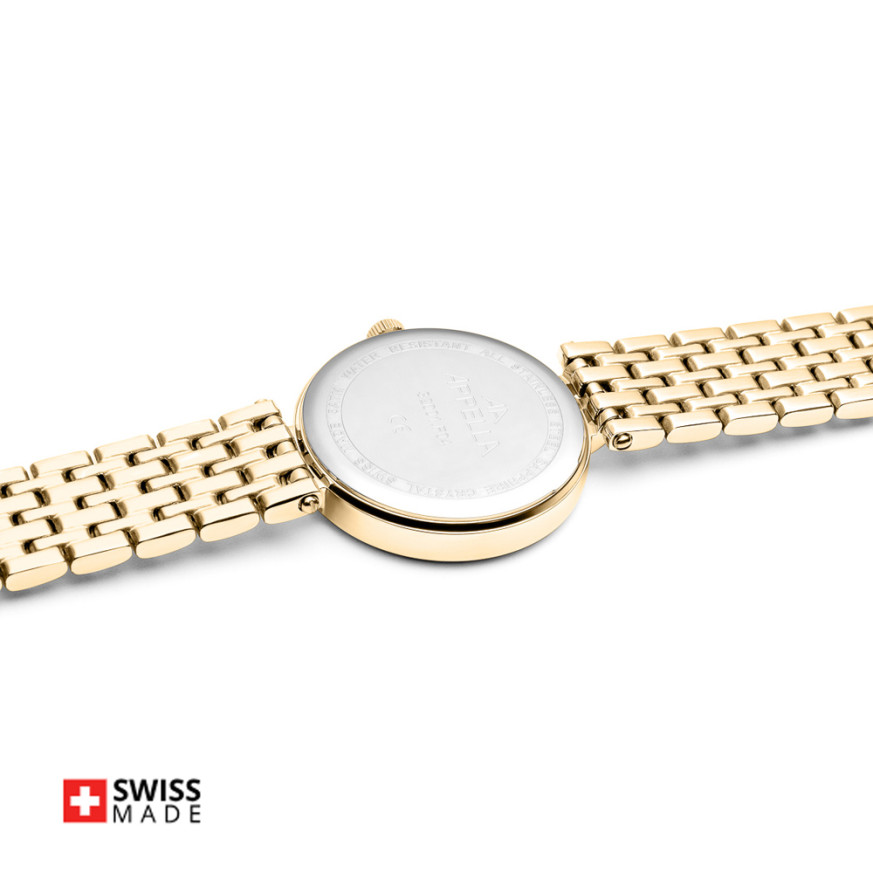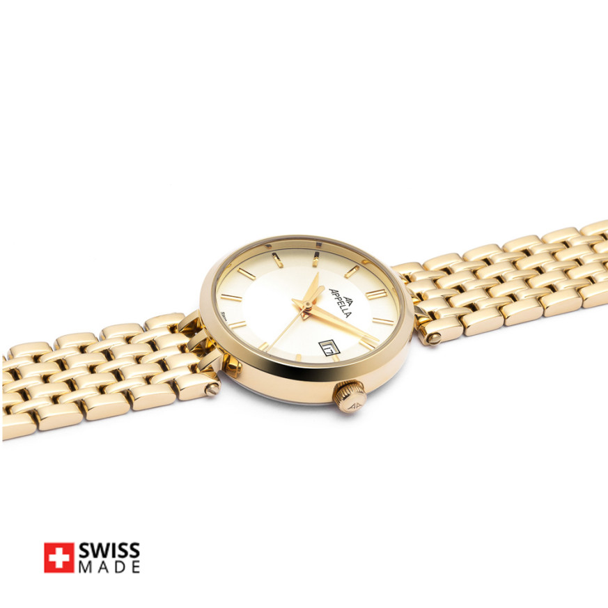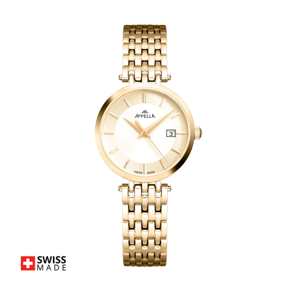 Стилен дамски часовник L32001.1111Q на швейцарската марка Appella. Циферблат в златист цвят с индикатор за дата. Корпус и верижка изработени от неръждаема стомана. Стъкло сапфир-кристал. Задвижва се от кварцов механизъм ETA F04 Swiss Made. Диаметър на корпуса 29 мм. Водоустойчивост 3 ATM - допускат се леки пръски, не се препоръчва обилно мокрене.