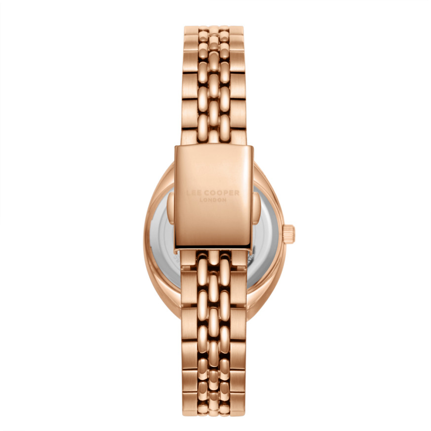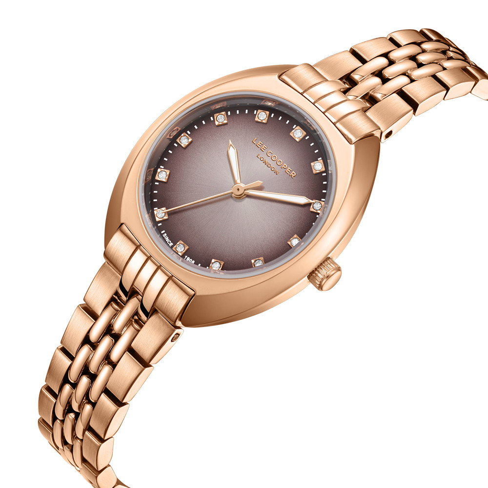 Дамски часовник Lee Cooper с елегантна визия. Моделът е с корпус от супер метал, съчетан с верижка от неръждаема стомана. Аналогов дисплей с декорация от инкрустирани кристали на индексите. Стъклото е минерал-кристал. Задвижва се от кварцов механизъм. Водоустойчивост 3 ATM - допускат се леки пръски, не се препоръчва обилно мокрене.