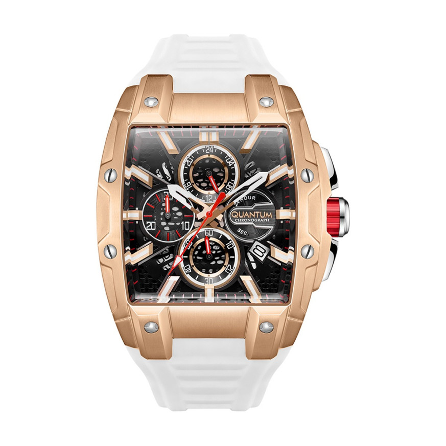 Впечатляващ модел мъжки часовник Quantum от колекцията Hunter. Дисплей хронограф с луминесцентно покритие върху стрелките и индексите. Стъкло минерал-кристал с антирефлексно покритие. Корпус от неръждаема стомана в комбинация със силиконова каишка. Задвижва се от кварцов механизъм. Водоустойчивост 10 ATM - позволява мокрене, къпане и плуване във водни басейни.