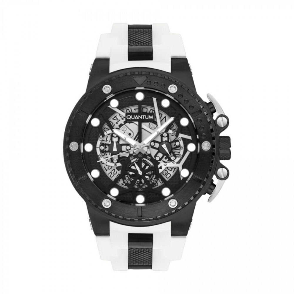 Страхотен модел мъжки часовник Quantum от колекцията Hunter. Дисплей комбинация от хронограф и скелетон с впечатляващ дизайн. Луминесцентно покритие върху стрелките и индексите. Стъкло минерал-кристал с антирефлексно покритие. Корпус от неръждаема стомана в комбинация със силиконова каишка. Диаметър на корпуса 50 мм. Часовникът се задвижва от кварцов механизъм. Водоустойчивост 10 ATM - позволява мокрене, къпане и плуване във водни басейни.