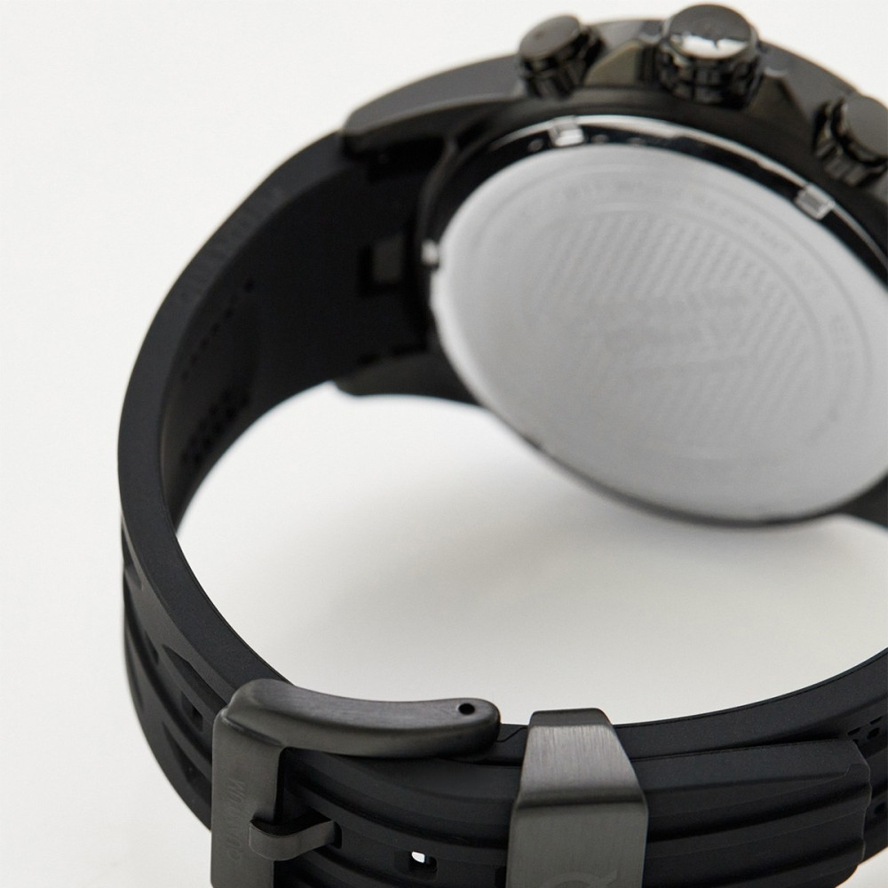 Мъжки часовник Quantum със спортен дизайн. Дисплей тип хронограф. Стъкло минерал-кристал. Корпус от неръждаема стомана. Черна силиконова каишка. Диаметър на корпуса 47 мм. Задвижва се от кварцов механизъм с калибър VR33B21. Водоустойчивост 10 ATM - позволява мокрене, къпане и плуване във водни басейни.