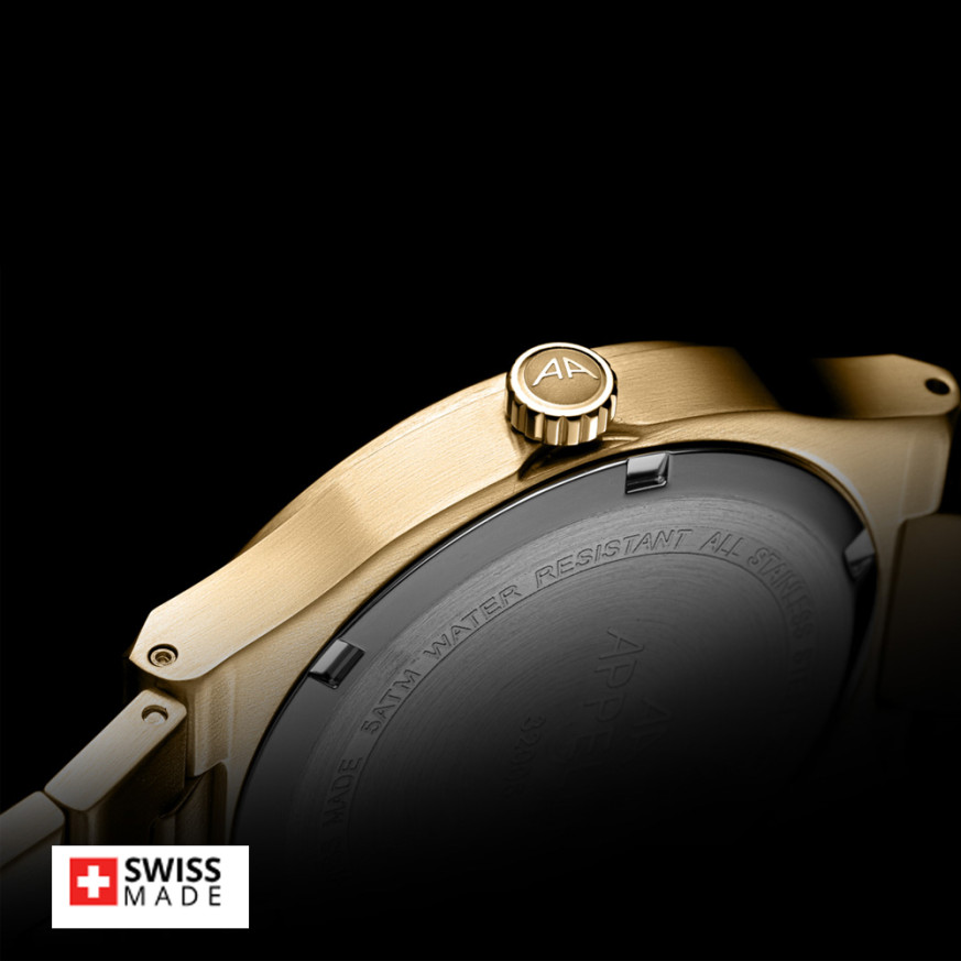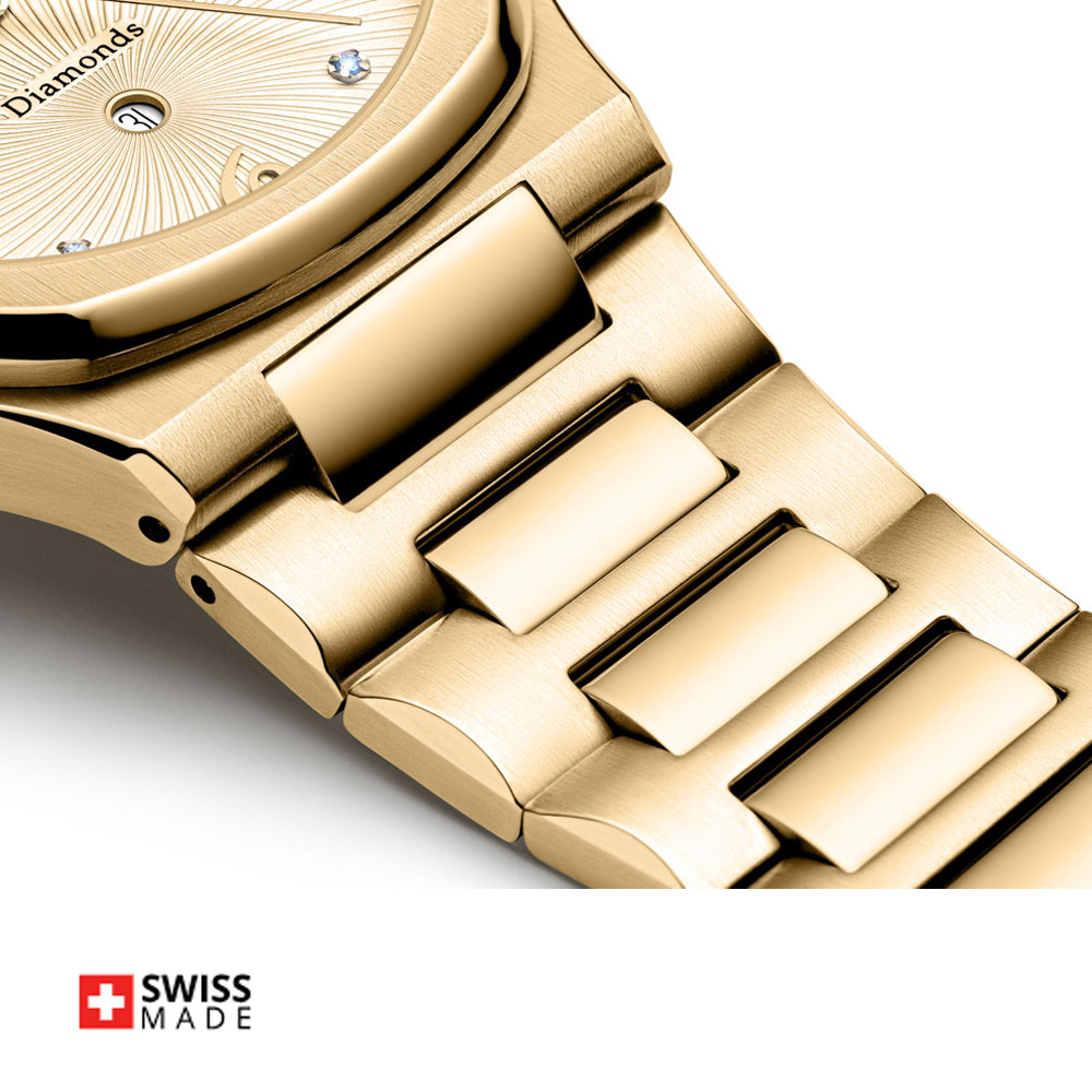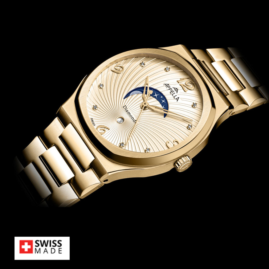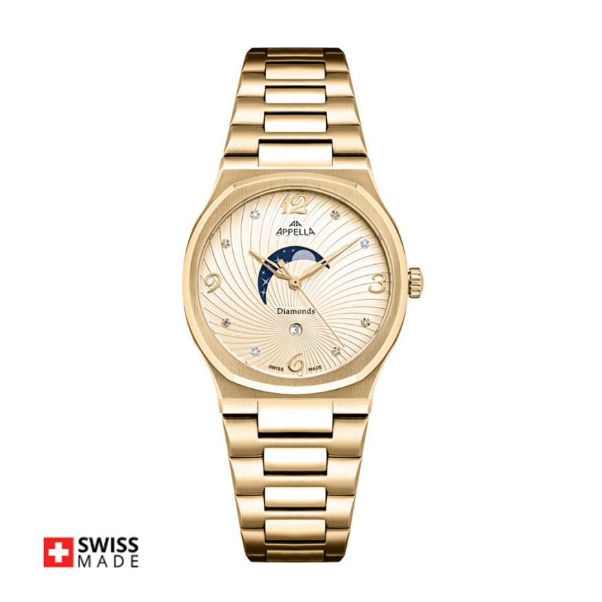 Дамски часовник Appella L32006.1171DQS е отличен избор за жени, които ценят елегантността и блясъка. Стоманения корпус в златист цвят хармонизира с красивия златист циферблат, украсен с диаманти, придавайки му уникален щрих. Моделът е с показател за дата и лунна фаза. Корпусът и верижката са  изработени от неръждаема стомана. Стъклото е сапфир-кристал. Задвижва се от кварцов механизъм RONDA 788 Swiss Made. Диаметър на корпуса 33 мм. Водоустойчивост 5 ATM - допускат се леки пръски и взимане на душ, не се препоръчва обилно мокрене.