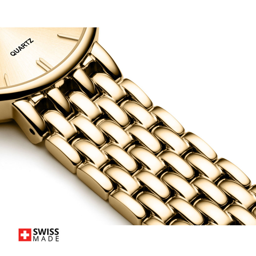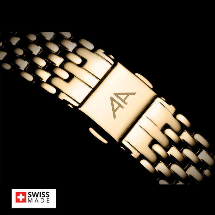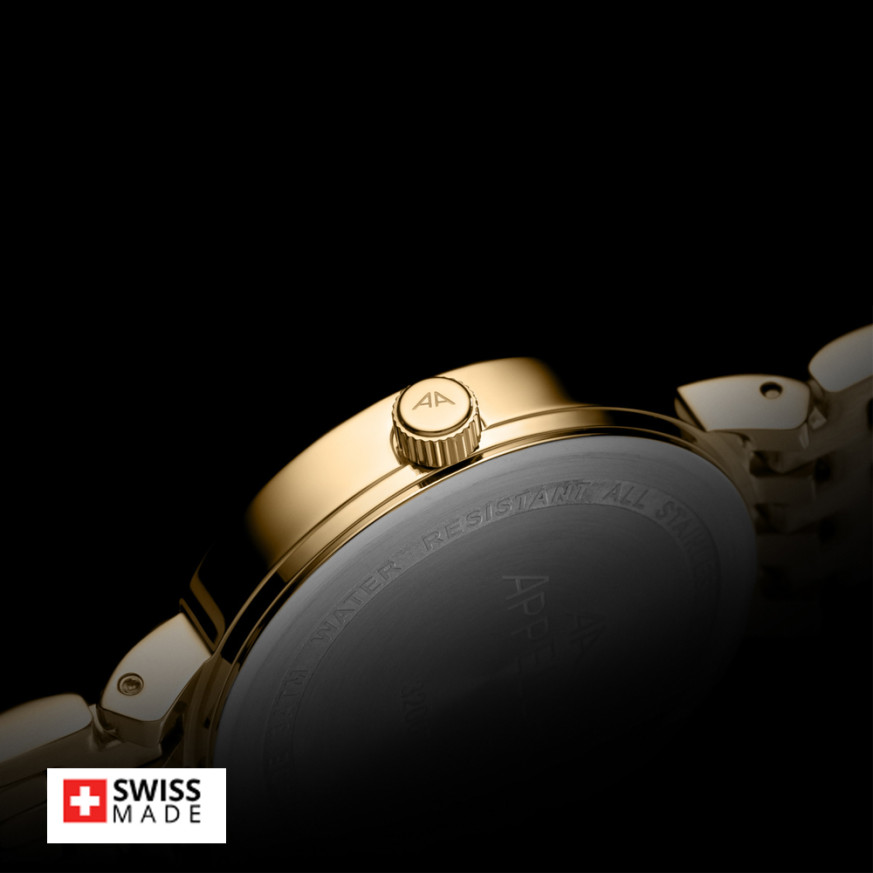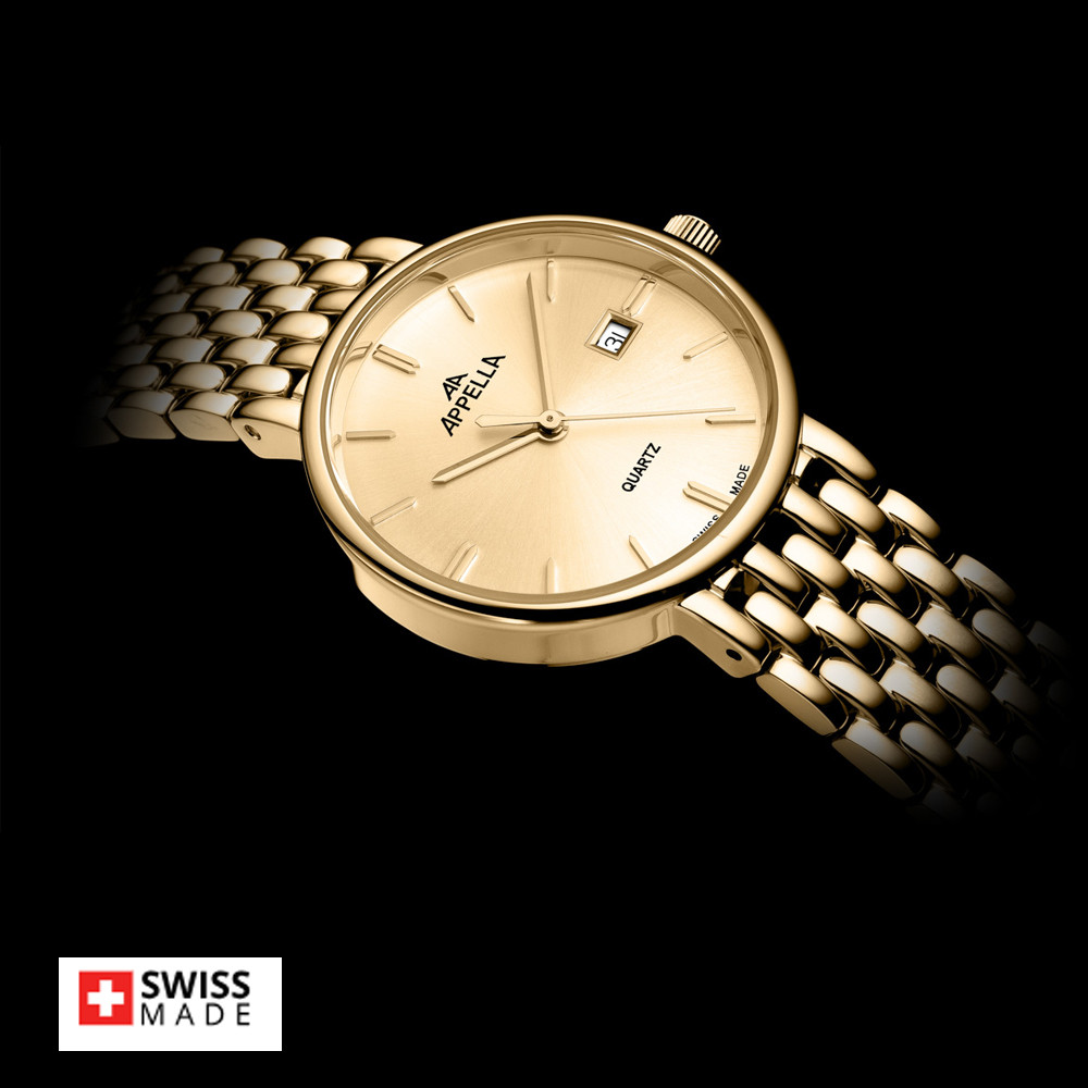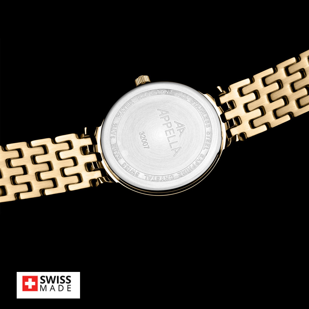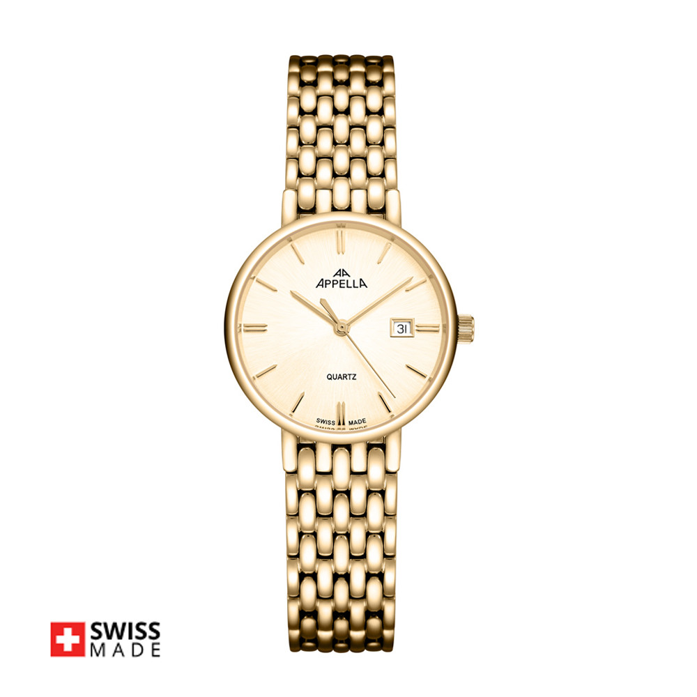Appella L32007.1111Q е елегантен дамски часовник с корпус и верижка изработени от неръждаема стомана. Циферблат в златист цвят с индикатор за дата. Стъкло сапфир-кристал. Задвижва се от кварцов механизъм RONDA 785 Swiss Made. Диаметър на корпуса 30 мм. Водоустойчивост 3 ATM - допускат се леки пръски, не се препоръчва обилно мокрене.