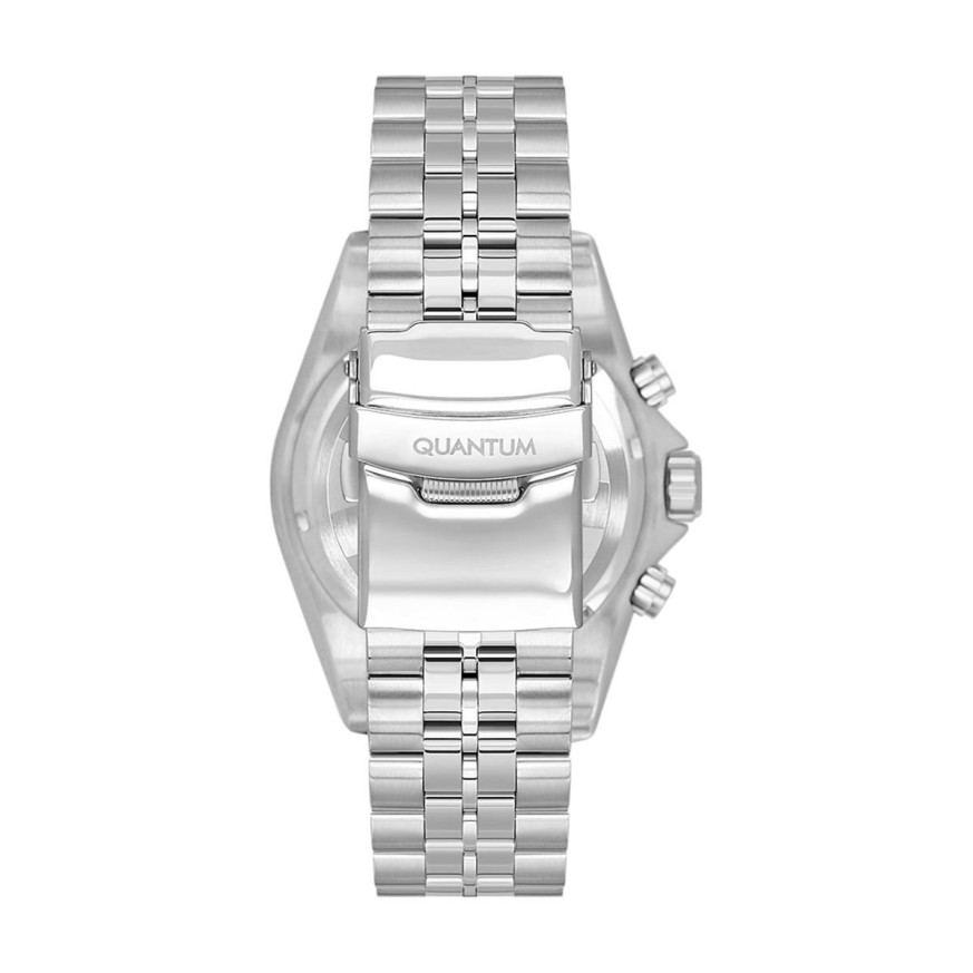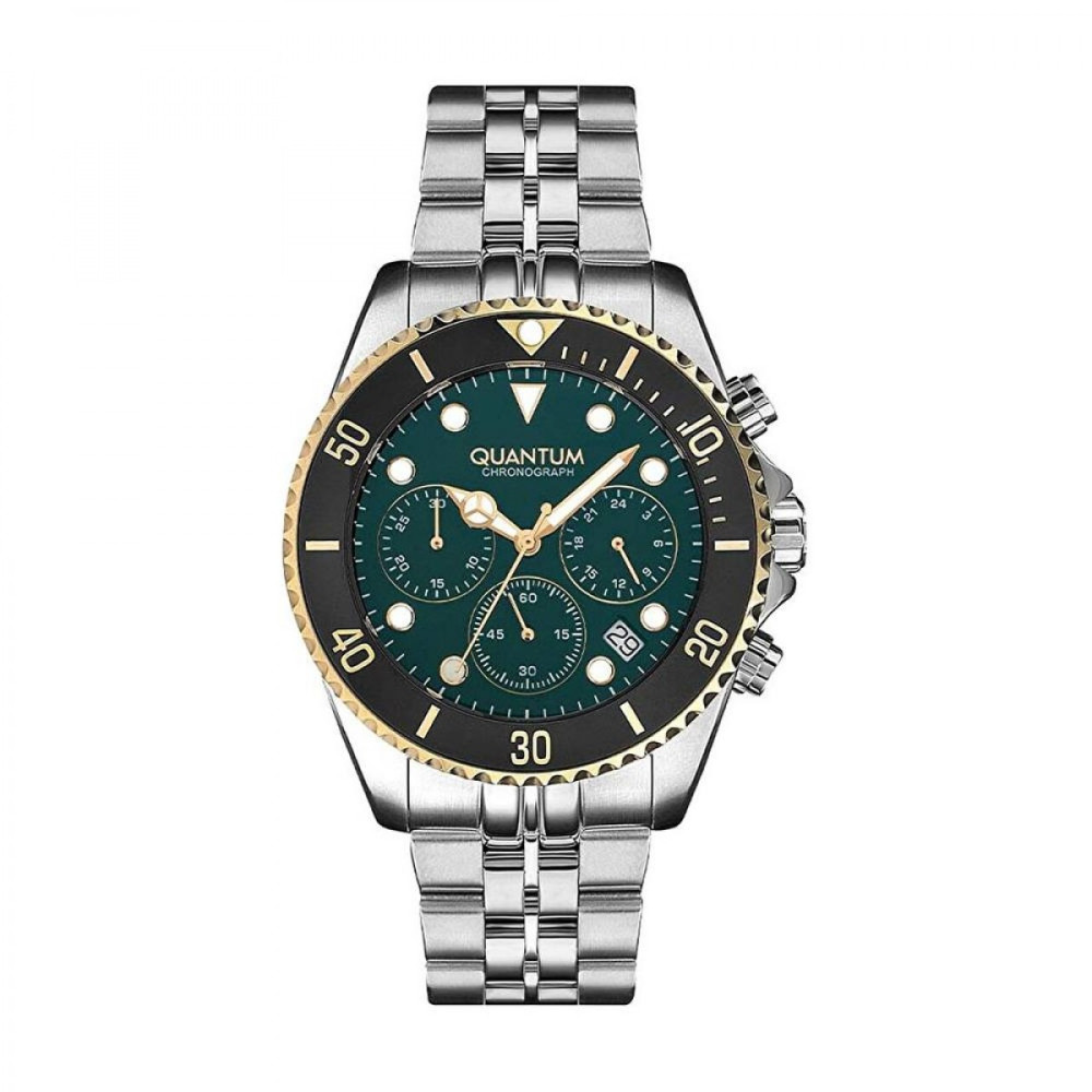 Спортно-елегантен мъжки часовник Quantum от колекцията Powertech. Дисплей хронограф с луминесцентно покритие на стрелките и индексите. Безел в черен цвят със златисти детайли. Стъкло минерал-кристал. Корпус и верижка изработени от неръждаема стомана. Диаметър на корпуса 44 мм. Часовникът се задвижва от кварцов механизъм с калибър VR32B15. Водоустойчивост 10 ATM - позволява мокрене, къпане и плуване във водни басейни.