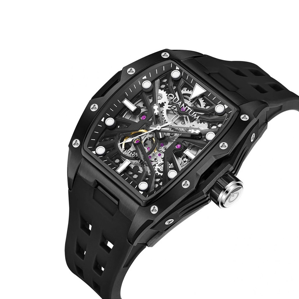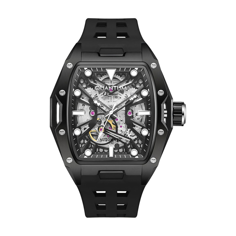 Впечатляващ модел мъжки часовник Quantum от колекцията Q-Master. Дисплеят на модела е скелетон с луминесцентно покритие на стрелките и индексите. Стъклото е минерал-кристал. Корпус от неръждаема стомана в комбинация със силиконова каишка. Часовникът се задвижва от автоматичен механизъм с калибър 82S0. Водоустойчивост 10 ATM - позволява мокрене, къпане и плуване във водни басейни.