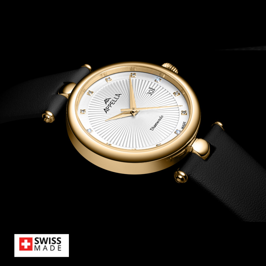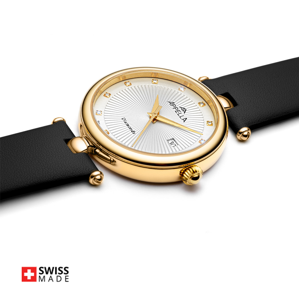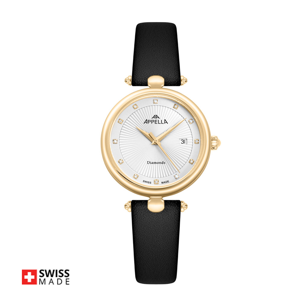 Елегантен дамски часовник Appella L50002.1243DQ с нежен дизайн. Циферблат в сребрист цвят, украсен с 12 диаманта и допълнен с индикатор за дата. Корпусът от неръждаема стомана. Черна каишка от естествена кожа. Стъкло сапфир-кристал. Задвижва се от кварцов механизъм ETA F04 Swiss Made. Диаметър на корпуса 31 мм. Водоустойчивост 3 ATM - допускат се леки пръски, не се препоръчва обилно мокрене.