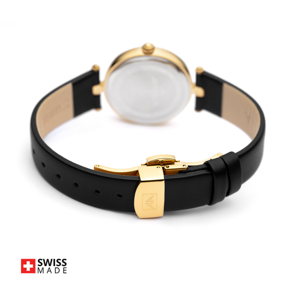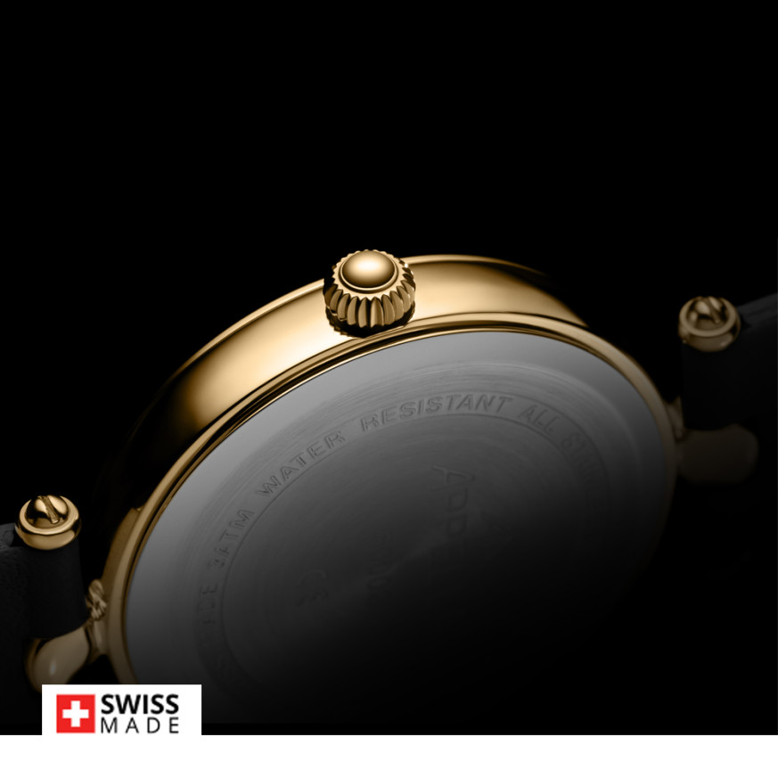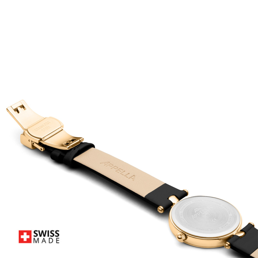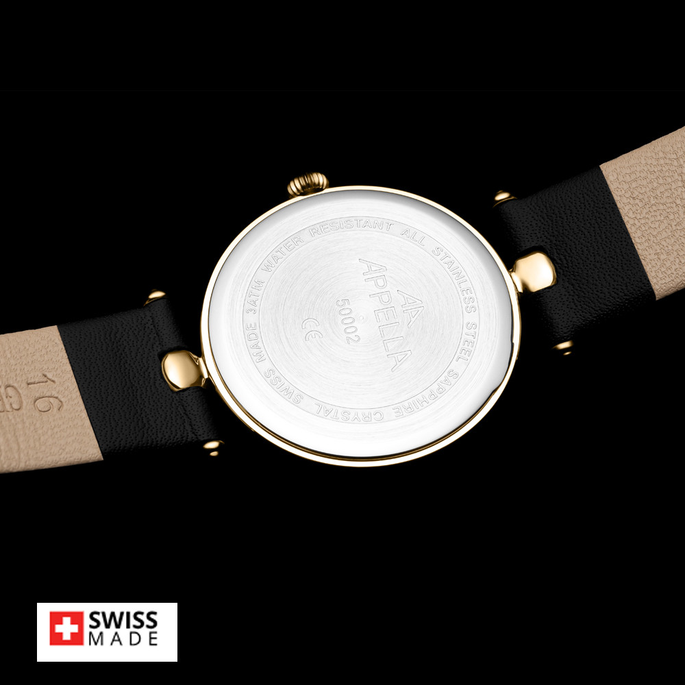 Елегантен дамски часовник Appella L50002.1243DQ с нежен дизайн. Циферблат в сребрист цвят, украсен с 12 диаманта и допълнен с индикатор за дата. Корпусът от неръждаема стомана. Черна каишка от естествена кожа. Стъкло сапфир-кристал. Задвижва се от кварцов механизъм ETA F04 Swiss Made. Диаметър на корпуса 31 мм. Водоустойчивост 3 ATM - допускат се леки пръски, не се препоръчва обилно мокрене.