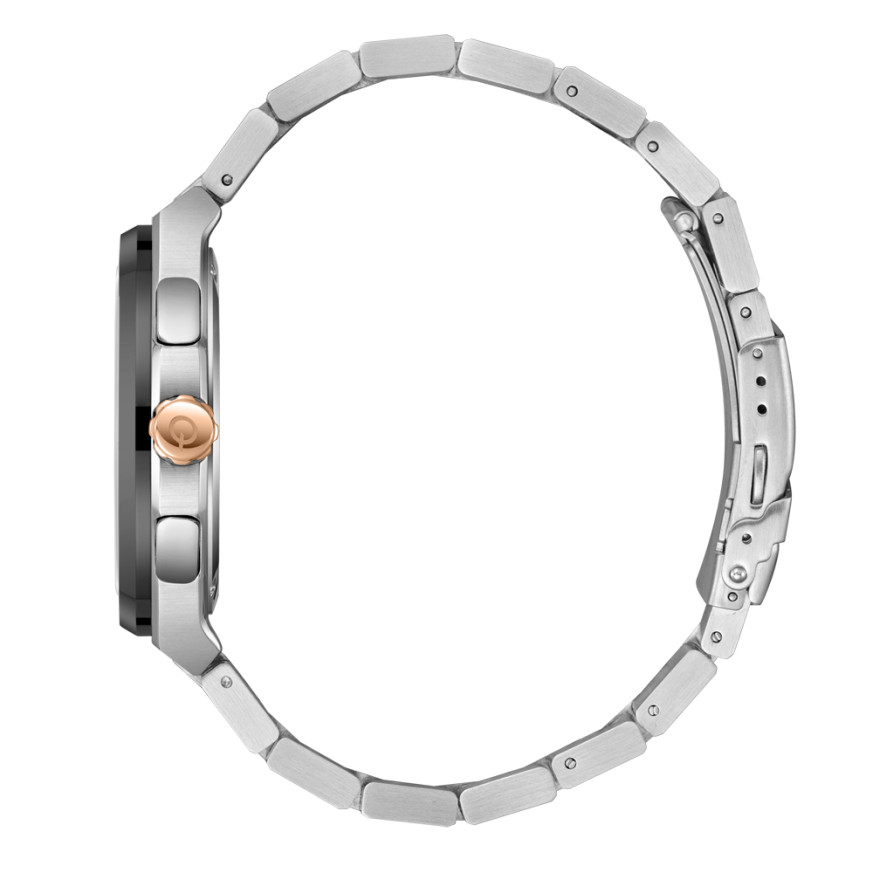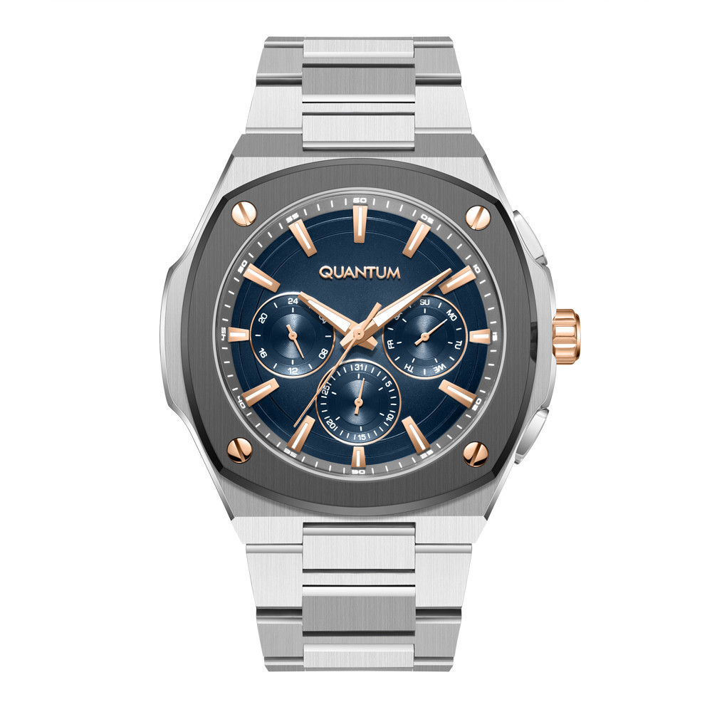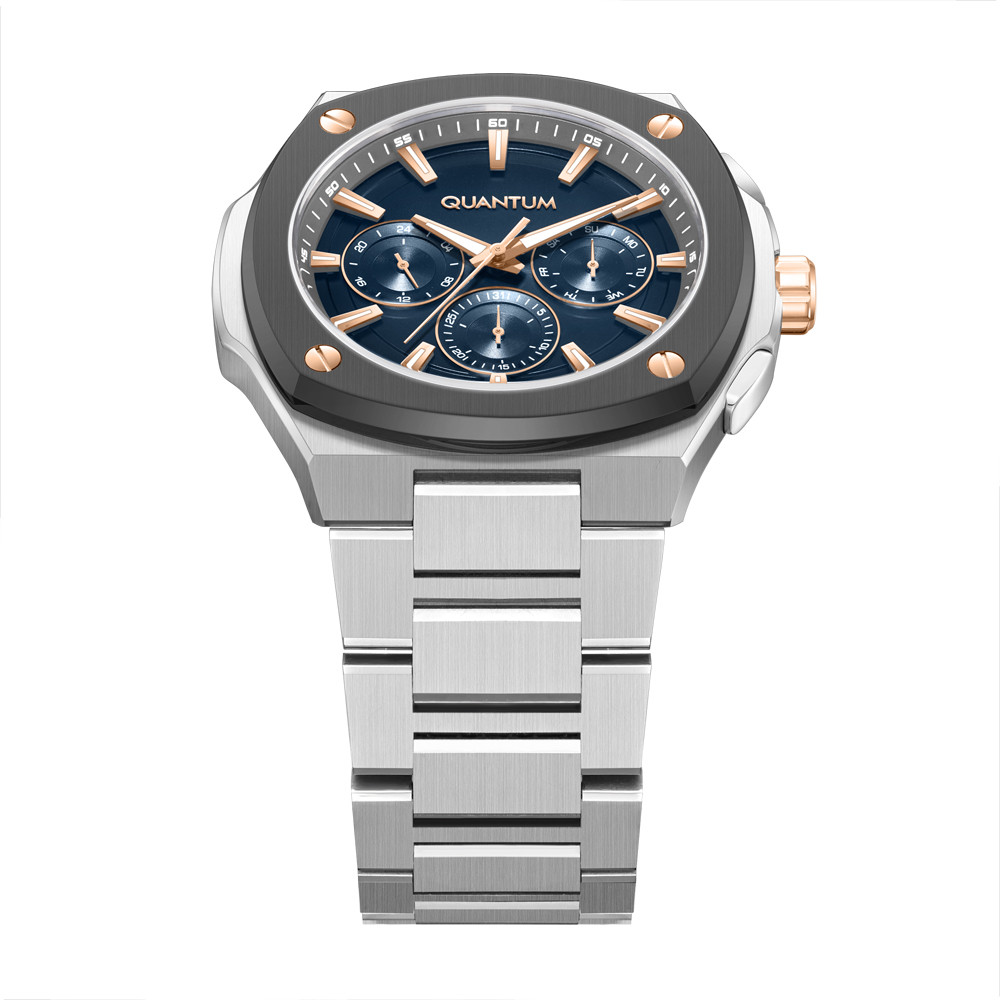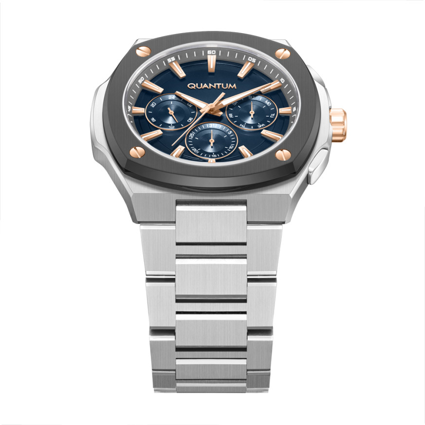 Мъжки часовник Quantum със спортно-ежедневен дизайн от колекцията Adrenaline. Тъмносин мултифункционален дисплей с детайли в цвят розово злато. Луминесцентно покритие върху стрелките и индексите. Стъкло минерал-кристал. Корпус и верижка изработени от неръждаема стомана. Диаметър на корпуса 44 мм. Задвижва се от кварцов механизъм с калибър VX9J. Водоустойчивост 10 ATM - позволява мокрене, къпане и плуване във водни басейни.