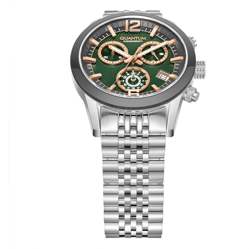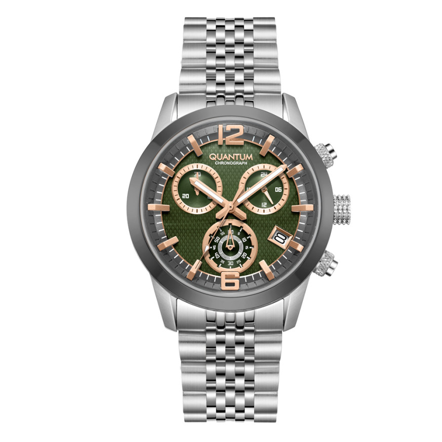 Страхотен модел мъжки часовник Quantum от колекцията Adrenaline. Дисплеят е тип хронограф в тъмнозелен цвят. Стъклото е минерал-кристал. Корпусът и верижката са изработени от неръждаема стомана. Диаметър на корпуса 43 мм. Задвижва се от кварцов механизъм с калибър VR34. Водоустойчивост 10 ATM - позволява мокрене, къпане и плуване във водни басейни.