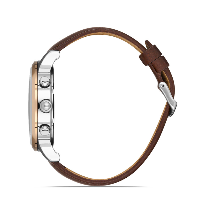 Спортно-елегантен модел мъжки часовник с мултифункционален дисплей, от колекцията Noble. Корпус изработен от неръждаема стомана. Кафява кожена каишка. Стъкло минерал-кристал. Кварцов механизъм. Водоустойчивост 5 ATM - допускат се леки пръски и взимане на душ, не се препоръчва обилно мокрене.