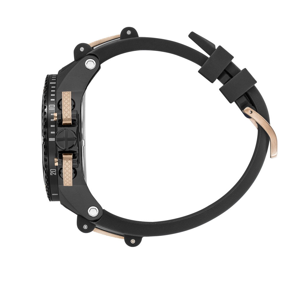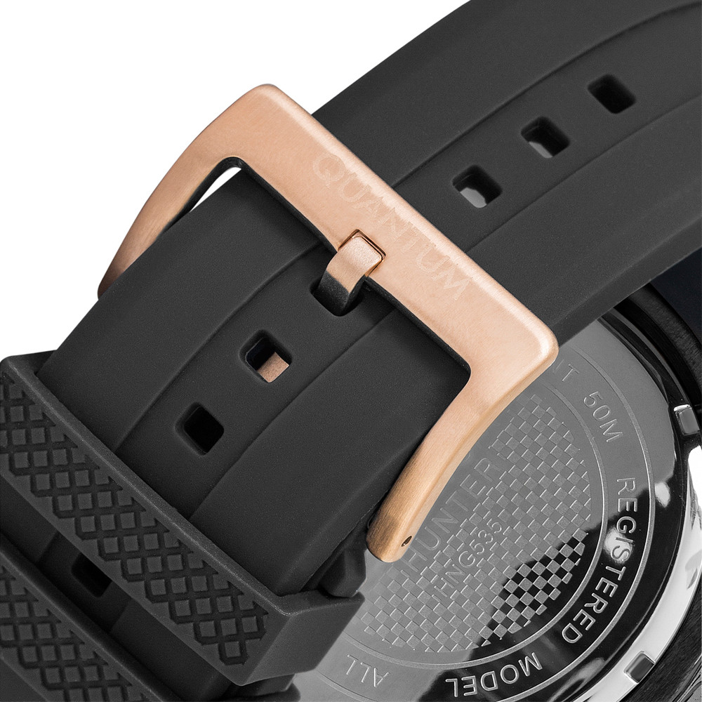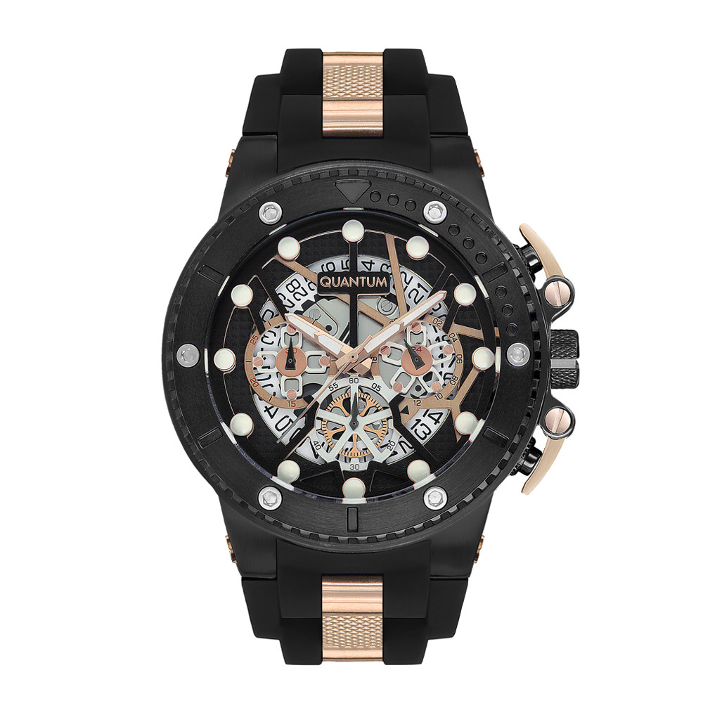 Страхотен модел мъжки часовник Quantum от колекцията Hunter. Дисплей комбинация от хронограф и скелетон с впечатляващ дизайн. Луминесцентно покритие върху стрелките и индексите. Стъкло минерал-кристал . Корпус изработен от неръждаема стомана. Черна силиконова саишка с детайли в цвят розово злато. Диаметър на корпуса 50 мм. Часовникът се задвижва от кварцов механизъм. Водоустойчивост 10 ATM - позволява мокрене, къпане и плуване във водни басейни.