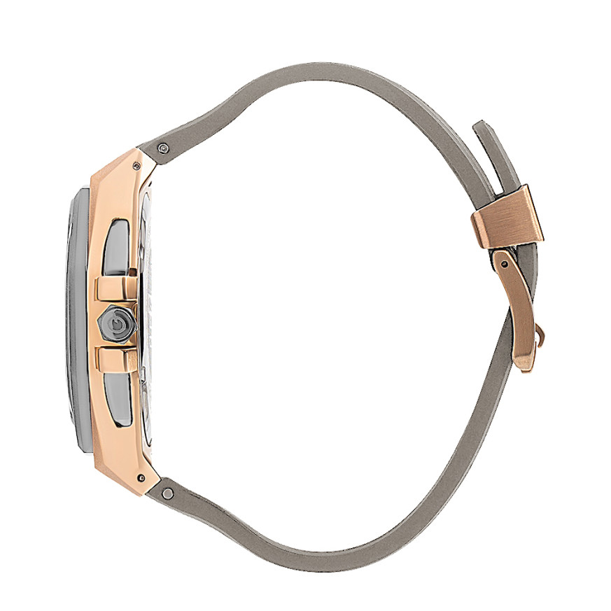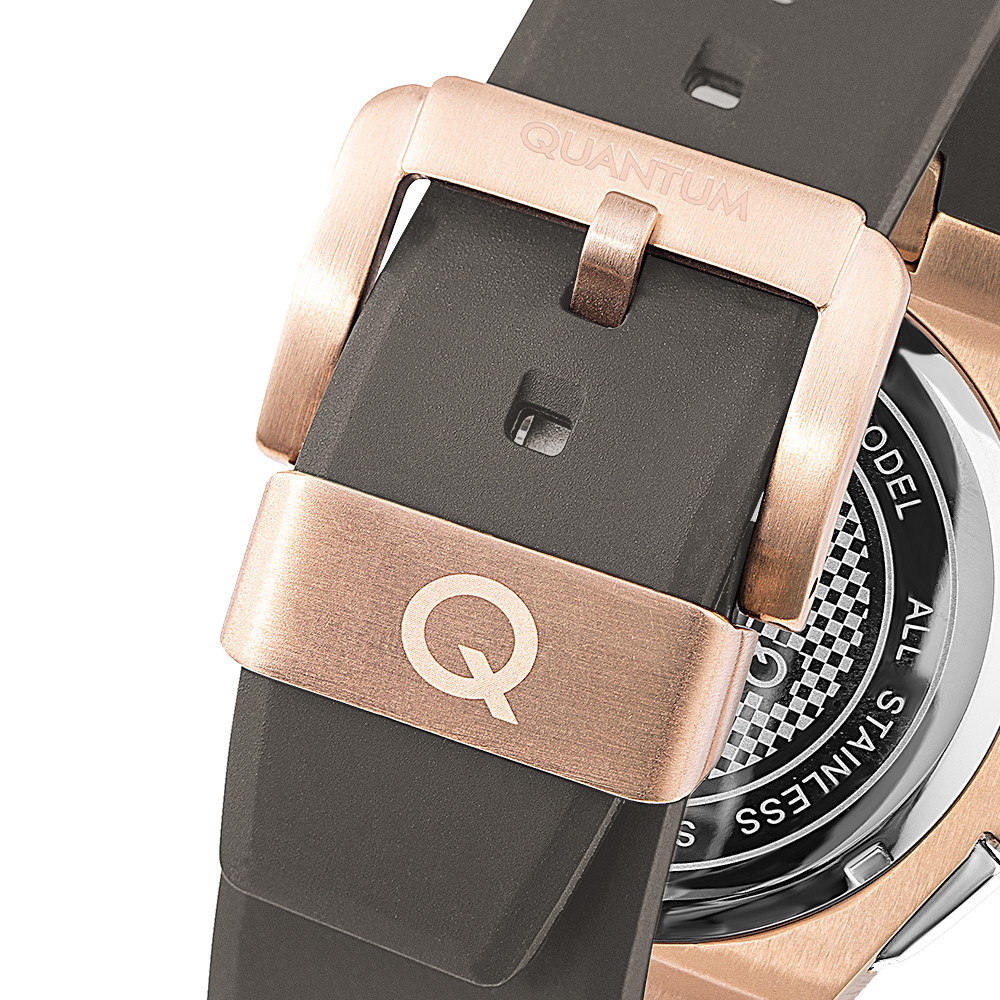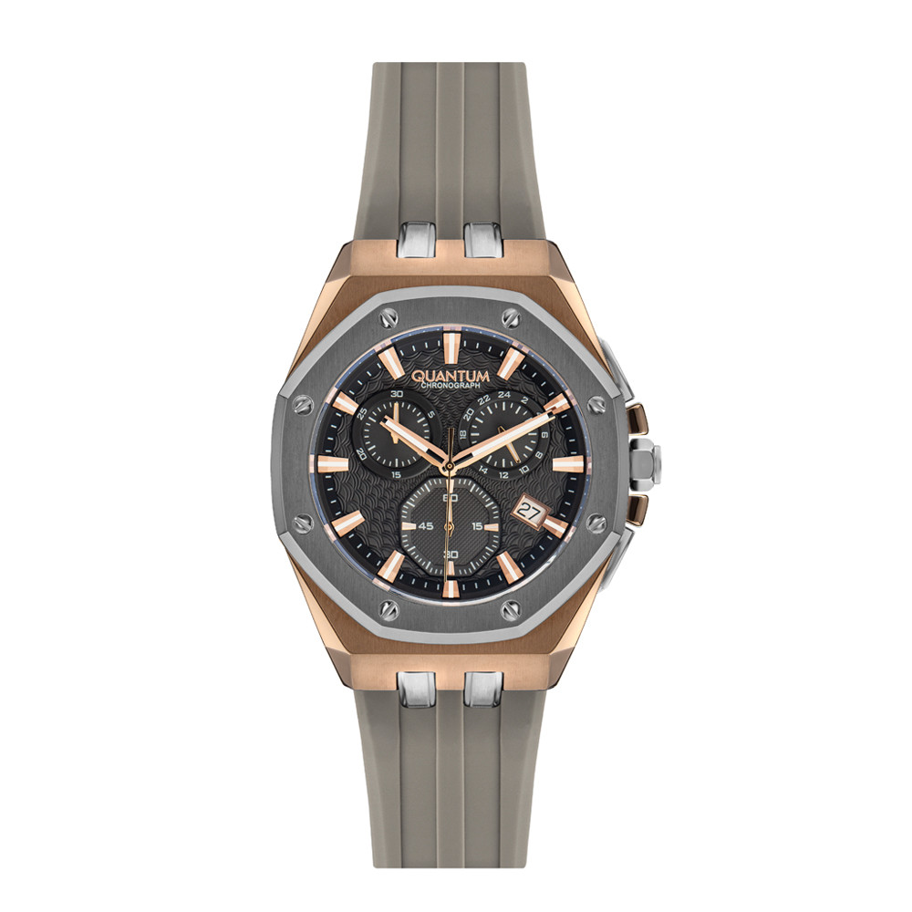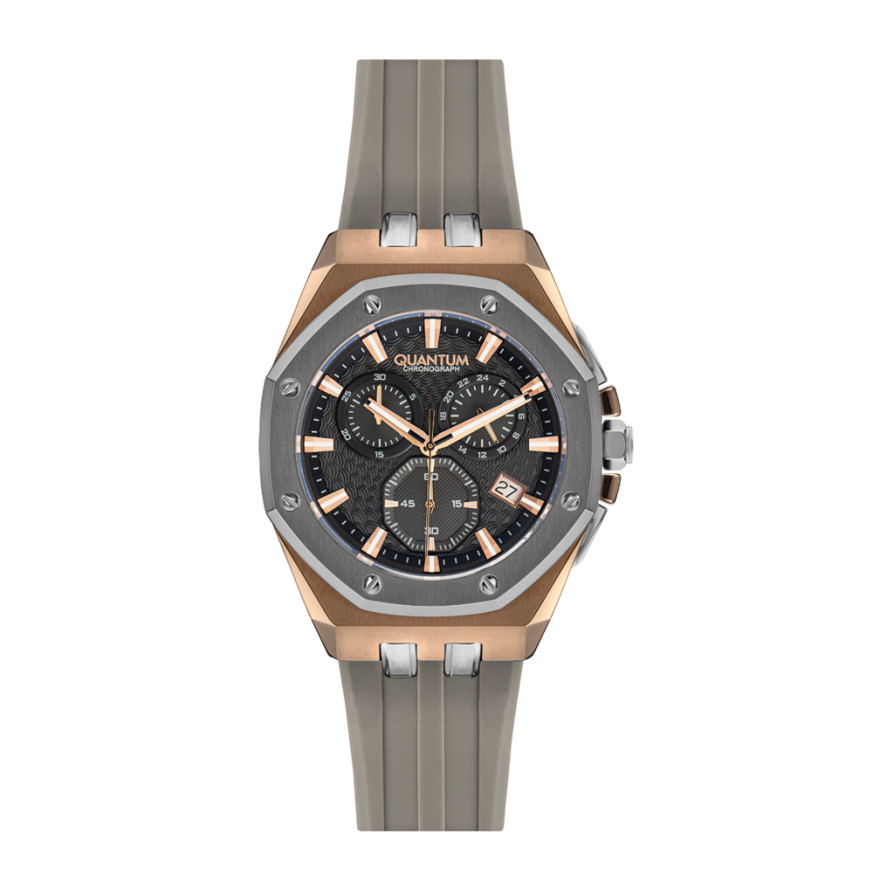 Мъжки часовник Quantum със спортно-ежедневен дизайн от колекцията Hunter. Дисплей тип хронограф в тъмносив цвят с детайли в цвят розово злато. Стъкло минерал-кристал. Луминесцентно покритие върху стрелките. Корпус от неръждаема стомана в комбинация със силиконова каишка. Диаметър на корпуса 45 мм. Задвижва се от кварцов механизъм. Водоустойчивост 10 ATM - позволява мокрене, къпане и плуване във водни басейни.