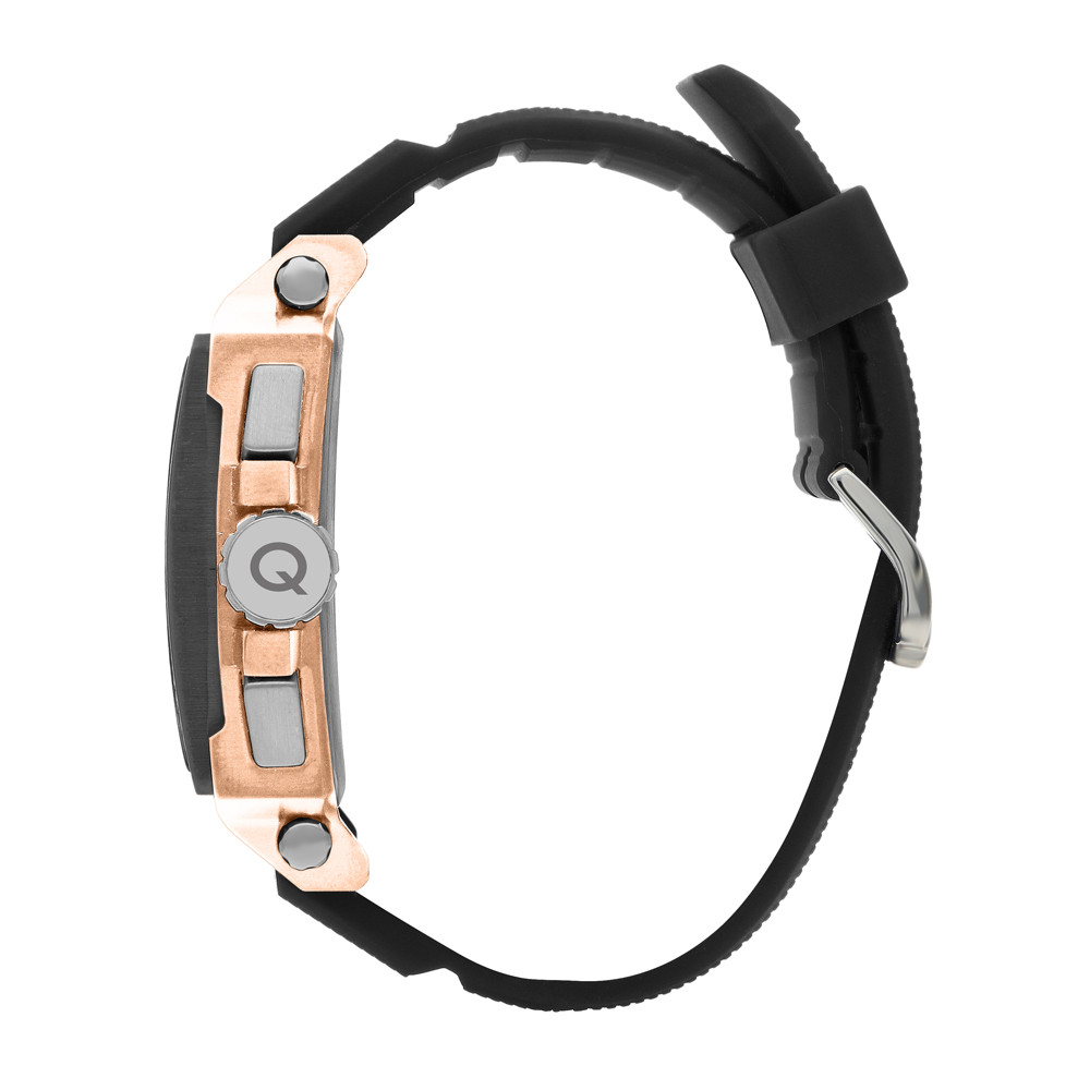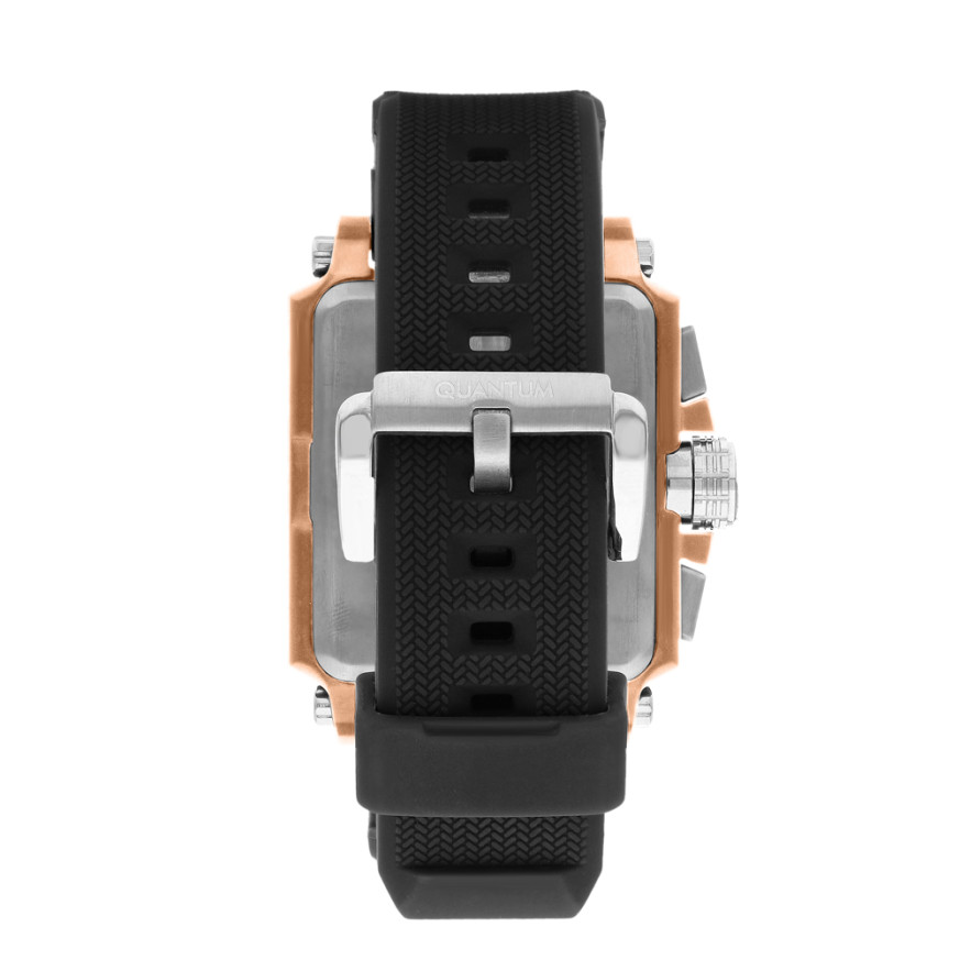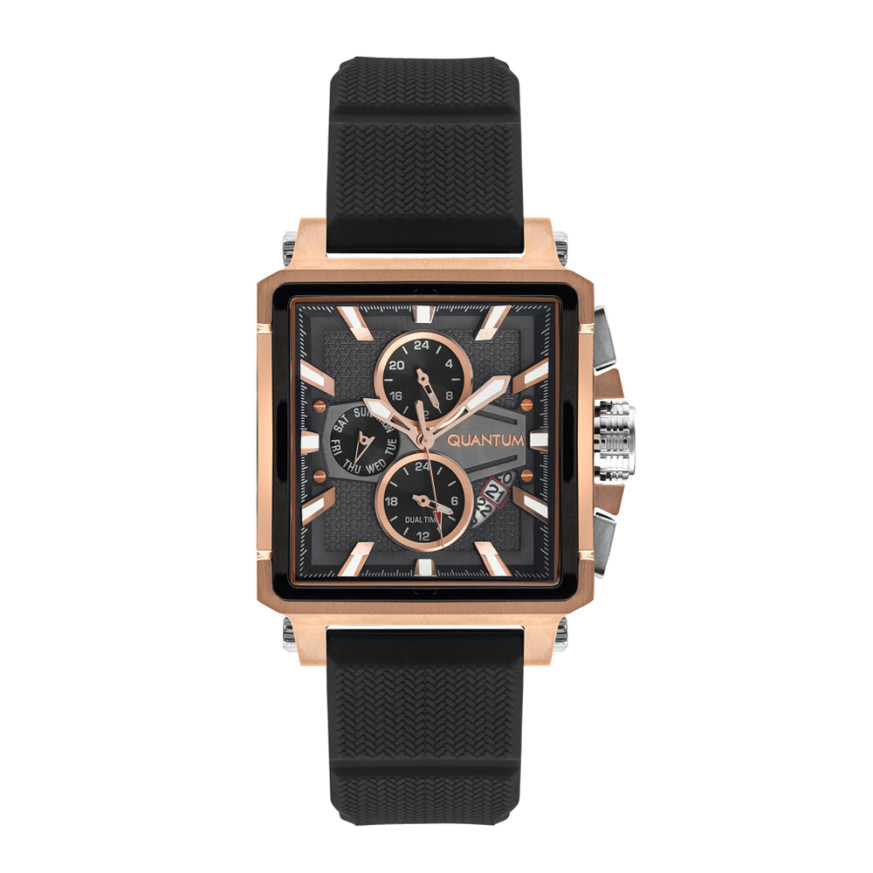 Мъжки часовник Quantum със спортно-ежедневен дизайн от колекцията Hunter. Мултифункционален дисплей с показатели за дата, ден от седмицата, 24-часов формат и двойно време. Луминесцентно покритие върху стрелките и индексите. Стъкло минерал-кристал. Корпус от неръждаема стомана в комбинация със силиконова каишка. Задвижва се от кварцов механизъм с калибър JP15. Водоустойчивост 10 ATM - позволява мокрене, къпане и плуване във водни басейни.