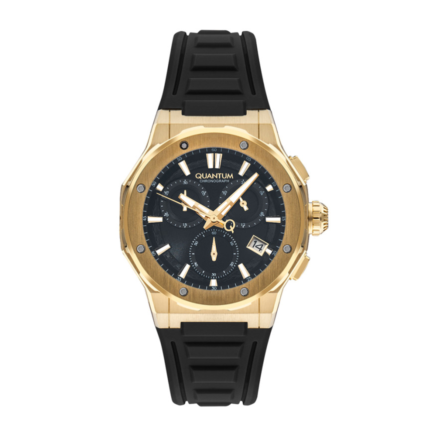 Мъжки часовник Quantum със спортно-ежедневен дизайн от колекцията Hunter. Моделът е с дисплей хронограф с луминесцентно покритие върху стрелките и индексите. Стъкло минерал-кристал. Корпус от неръждаема стомана в комбинация със силиконова каишка. Диаметър на корпуса 46 мм.  Задвижва се от кварцов механизъм с калибър VR33. Водоустойчивост 10 ATM - позволява мокрене, къпане и плуване във водни басейни.