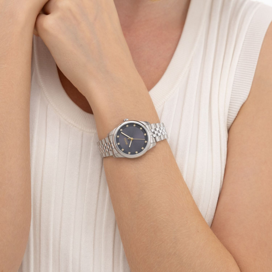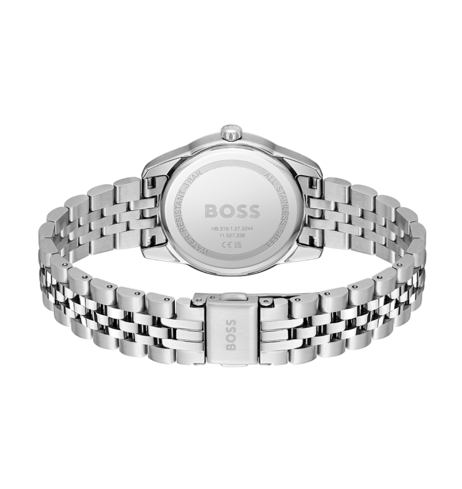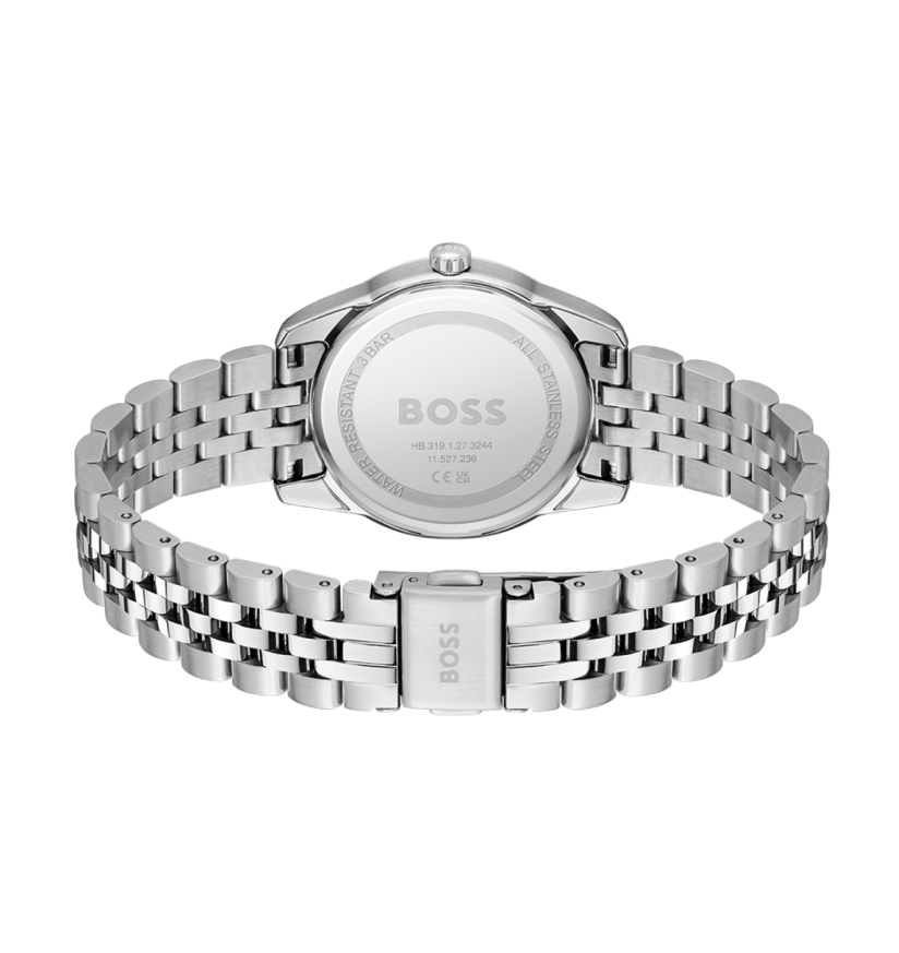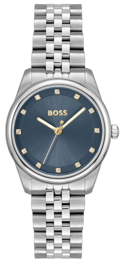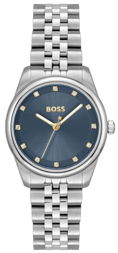 Часовник HUGO BOSS 1502809 – дамски кварцов модел, който съчетава елегантност и модерен блясък. Корпусът от полирана неръждаема стомана с диаметър 32 мм е украсен с деликатно инкрустирани цирконии по безела, придаващи женствено сияние. Тъмносиният циферблат със сребристи стрелки и минималистични индекси подчертава изчистения дизайн. Кварцовият механизъм осигурява надеждност, минералното стъкло предпазва от надрасквания, а водоустойчивостта до 3 ATM гарантира практичност. HUGO BOSS 1502809 е перфектен аксесоар за дамата, която цени стил и фините детайли.