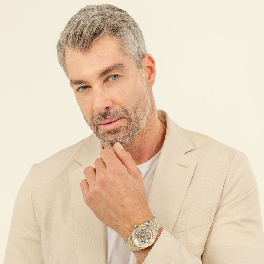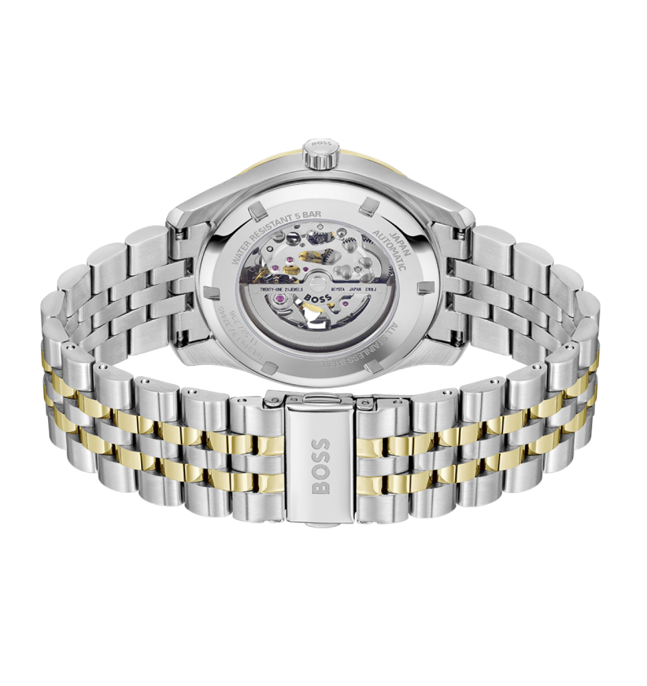 Часовник HUGO BOSS 1514237 Principle Skeleton – елегантен мъжки автоматичен модел със скелетон дизайн, който разкрива фината работа на механизма. Корпусът и верижката от неръждаема стомана с жълто PVD покритие подчертават луксозното излъчване, а римските цифри добавят класически акцент. С автоматичен механизъм Miyota 8N24, който не изисква батерия, диаметър 41 мм и минерално стъкло, моделът комбинира стил и надеждност. Водоустойчивостта до 3 ATM го прави подходящ за дъжд и пръски.
