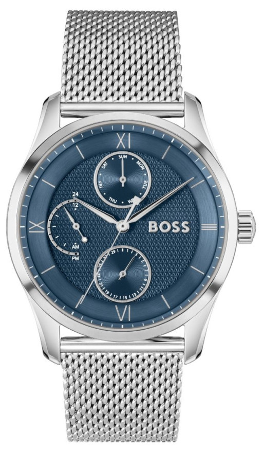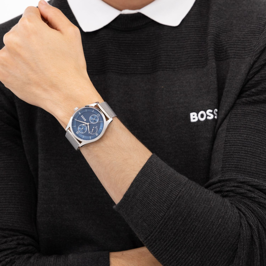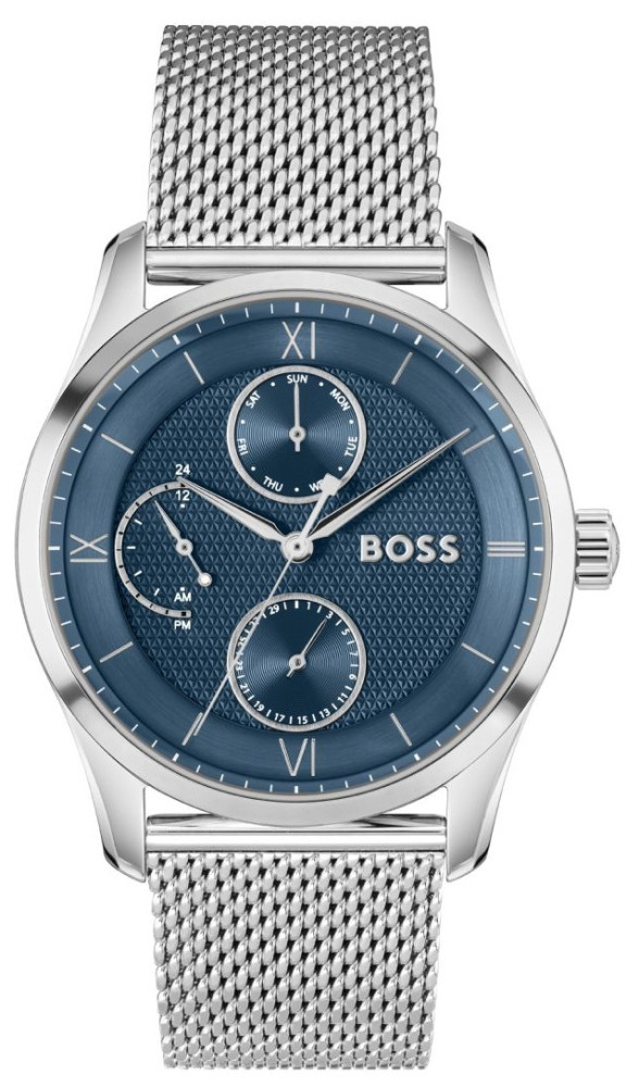Часовник HUGO BOSS 1514276 – мъжки модел с елегантна визия и модерен характер. Корпусът и Mesh верижката са изработени от неръждаема стомана, осигуряваща издръжливост и удобство при носене. Тъмносиният циферблат със сребристи стрелки и индекси подчертава класическата линия, допълнена от практични функции – ден от седмицата, дата и 24-часов индикатор. Кварцовият механизъм гарантира точност, а водоустойчивостта до 5 ATM прави HUGO BOSS 1514276 подходящ за ежедневие и официални поводи.