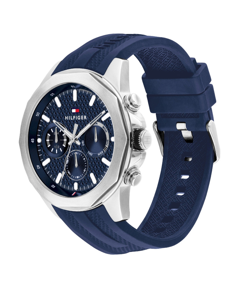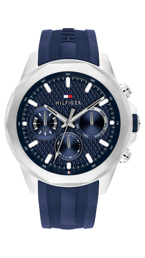 Tommy Hilfiger 1710649 съчетава спортна функционалност и изчистен дизайн, идеален за ежедневно носене. Корпусът е изработен от благородна стомана, а тъмният циферблат разполага с индикации за ден от седмицата, дата и 24-часов формат. Сребристите стрелки и индекси осигуряват контраст и добра четимост. Силиконовата каишка предлага комфорт, устойчивост и лекота при активен начин на живот. Моделът е защитен с минерално стъкло и има водоустойчивост до 5 ATM. Задвижван е от кварцов механизъм с международна гаранция от 2 години.