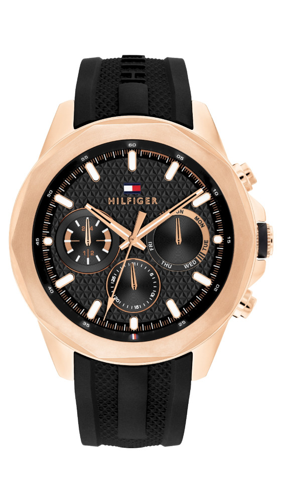 Tommy Hilfiger 1710650 е модерен спортен часовник, създаден за активното ежедневие. Корпусът е изработен от благородна стомана с PVD покритие, което осигурява издръжливост и стил. Тъмният циферблат включва индикации за ден от седмицата, дата и 24-часов формат – практични функции, комбинирани с елегантен дизайн. Черната силиконова каишка гарантира комфорт при носене, устойчивост на износване и гъвкавост. Минералното стъкло предпазва часовника от надрасквания, а водоустойчивостта до 5 ATM го прави надежден спътник в ежедневието. Кварцовият механизъм е покрит с 2 години международна гаранция.