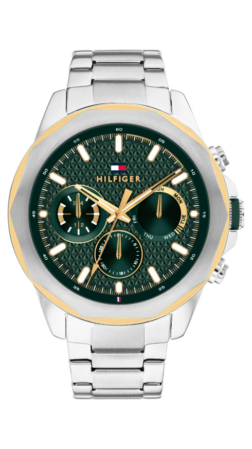Tommy Hilfiger 1710651 е стилен спортен часовник с изразена мъжествена визия и практична функционалност. Зеленият циферблат включва индикации за ден от седмицата, дата и 24-часов формат, като е акцентиран със златисти стрелки за контраст и елегантност. Корпусът и верижката са изработени от висококачествена благородна стомана, осигуряваща устойчивост и здравина. Минералното стъкло предпазва от надрасквания, а водоустойчивостта до 5 ATM прави модела подходящ за ежедневна употреба. Кварцовият механизъм е покрит с 2 години международна гаранция.