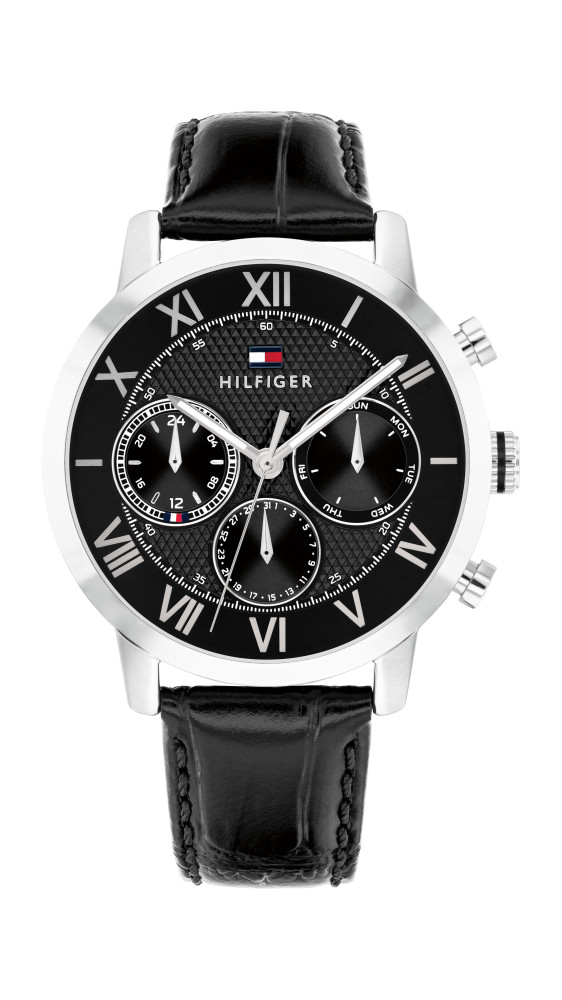 Часовник Tommy Hilfiger 1710725 съчетава елегантен класически стил и функционалност, подходяща за ежедневието и формални поводи. Корпусът от благородна стомана придава стабилност и качество, докато черният циферблат с римски цифри и сребристи стрелки осигурява отлична четимост и стилен контраст. Моделът разполага с индикации за дата, ден от седмицата и 24-часов формат. Черната кожена каишка допринася за комфорт и изискан вид, а минералното стъкло и водоустойчивостта 5 ATM гарантират надеждност.